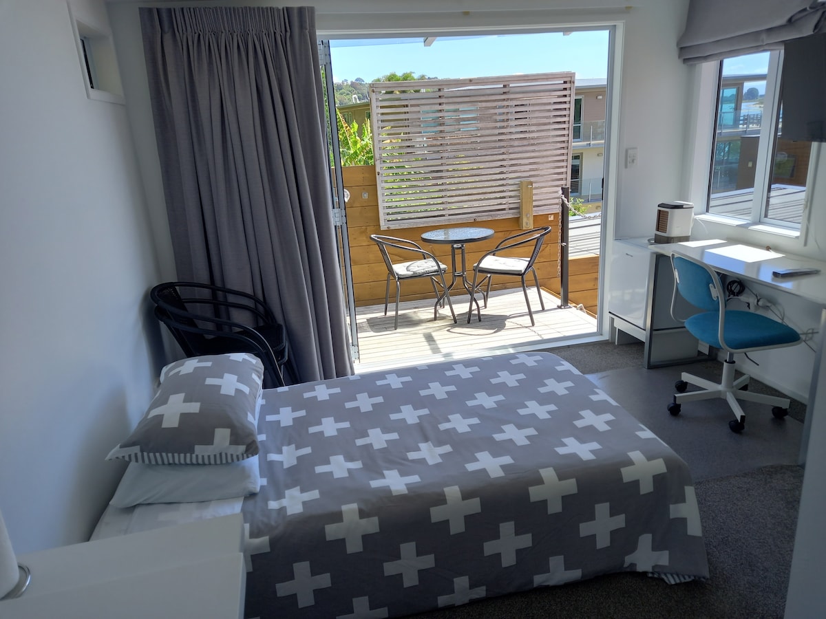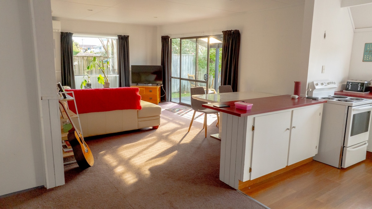 Step out of the studio onto the beach access where you get to see the amazing views down the walkway. (Beach views are not from the studio). Relax and open the french doors to your private patio and grassed area, overlooking the whakatane ranges. Newly built self contained studio with a kitchenette and laundry facilities. Enjoy an outdoor hot and cold shower and a filleting bench for those beach and fishing days. Pet friendly with grass enclosed area.