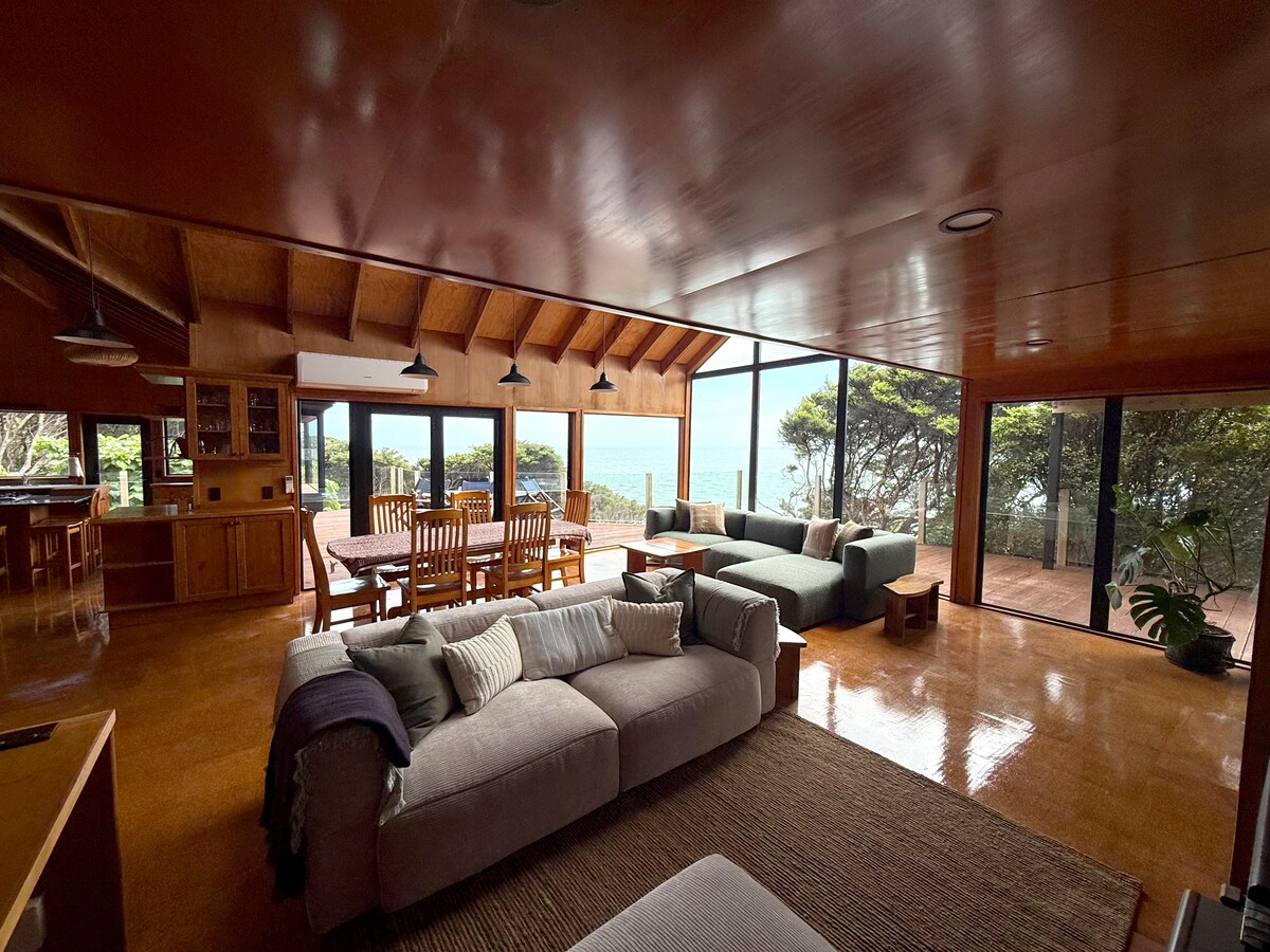Absolute waterfront accommodation right on the surf, is the modern Whale Bay Surf Bach Stylish 2bedroom ocean front, ground floor apartment nestled in a private, sub-tropical garden with the famous left hand point break out front & private access to the surf & boardwalk Soak in the surf & magical sunsets from the spa & enjoy watching the waves roll in from the bedroom, living or large deck & grass area - you'll be in absolute awe of the incredible views & entertained by our unique surroundings