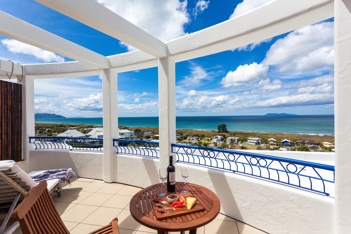 Dreaming of the Greek Islands? The Sky Apartment is a romantic, Mediterranean-inspired hideaway perched above Waihi Beach with sweeping ocean views. This fully self-contained apartment offers a mezzanine queen bedroom, cosy lounge, compact kitchenette and private deck overlooking the beach to Mayor Island. A charming character space with architectural quirks, not ultra-modern. Private entrance, parking and a short walk to the beach.