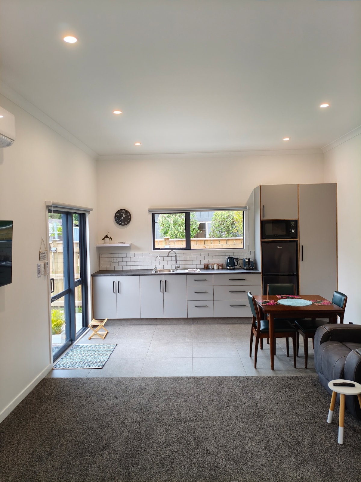 Tastefully decorated comfortable 1 bedroom fully self-contained guesthouse separate from the family home. Open plan kitchen and living area, with a selection of games/puzzles and books available for your enjoyment. Main bedroom with king-size bed, portacot available if required. Ecosa sofabed in the lounge folds out to a comfortable queen bed. Continental breakfast provided to enjoy with your morning Nespresso coffee. Close to sports grounds, supermarkets and town.