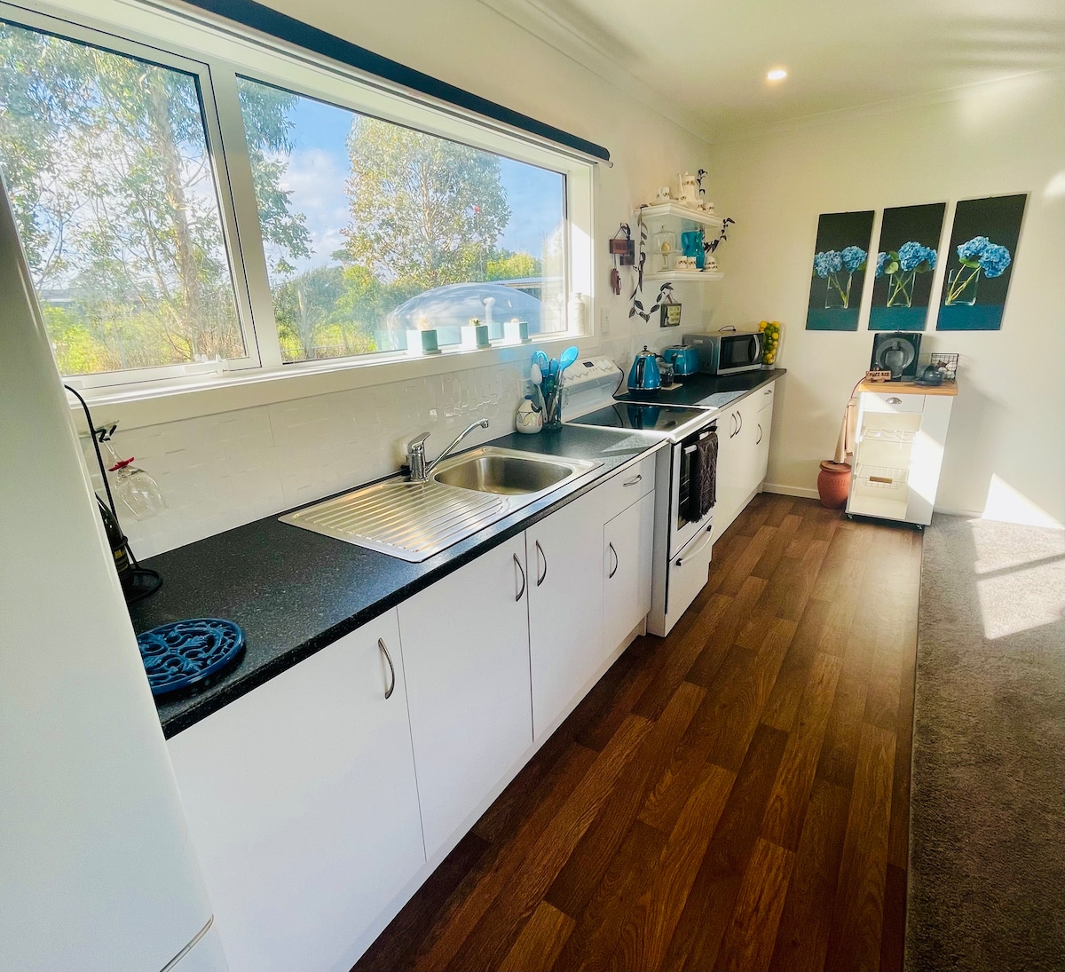 Tastefully decorated comfortable 1 bedroom fully self-contained guesthouse separate from the family home. Open plan kitchen and living area, with a selection of games/puzzles and books available for your enjoyment. Main bedroom with king-size bed, portacot available if required. Ecosa sofabed in the lounge folds out to a comfortable queen bed. Continental breakfast provided to enjoy with your morning Nespresso coffee. Close to sports grounds, supermarkets and town.