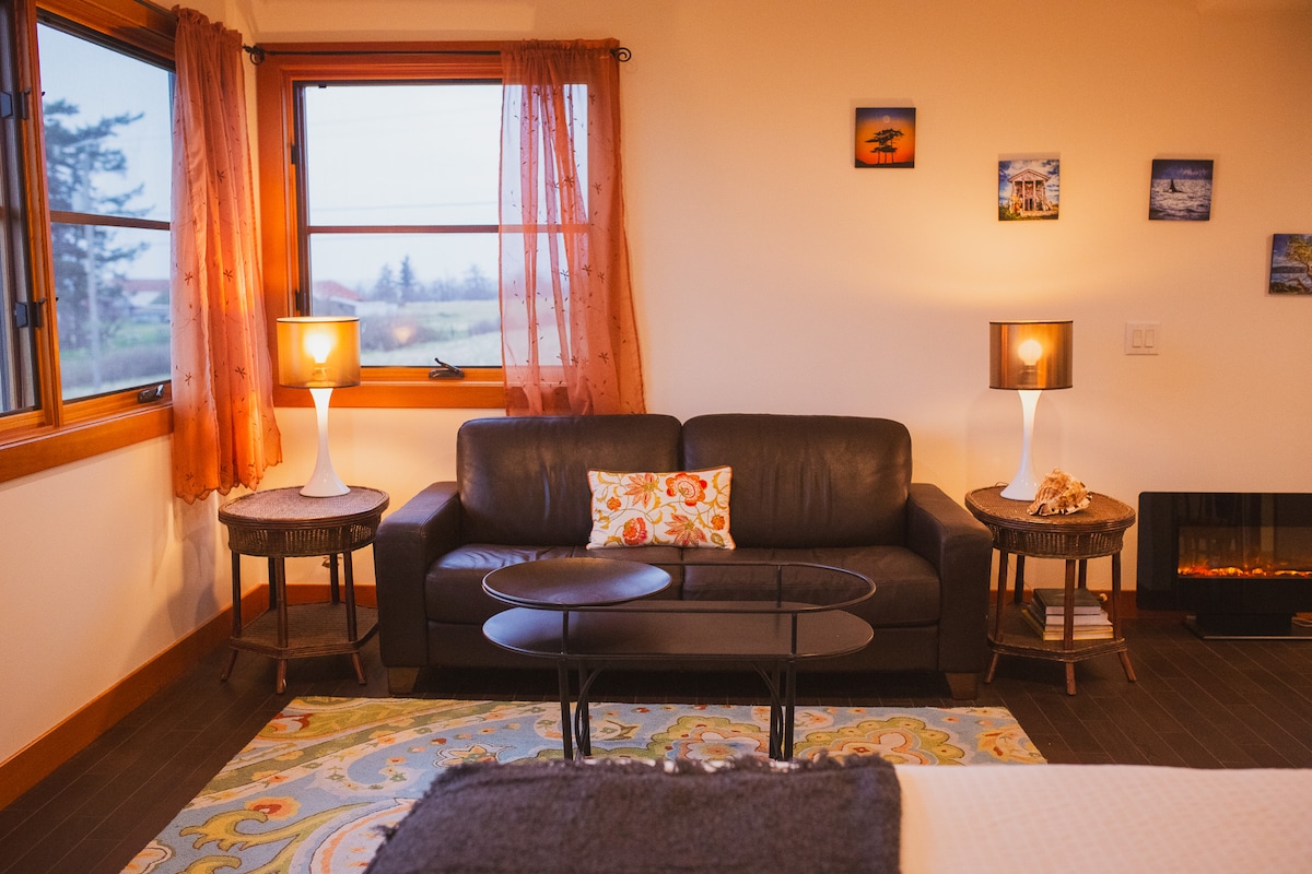 Treehouse-style apartment perched above Lummi Bay with western exposure and sweeping views of the San Juan Islands and Canadian Coast Range. Enjoy heated floors, a gas fireplace, and a spa-like steam shower. Watch eagles and passing ships, relax by the beach firepit, and cook in the fully equipped gourmet kitchen. Ideally located between Vancouver, Mt. Baker, Seattle, and Hwy 20 to Eastern Washington — a perfect Pacific Northwest escape. *Note- this unit shares the property with a rental home.