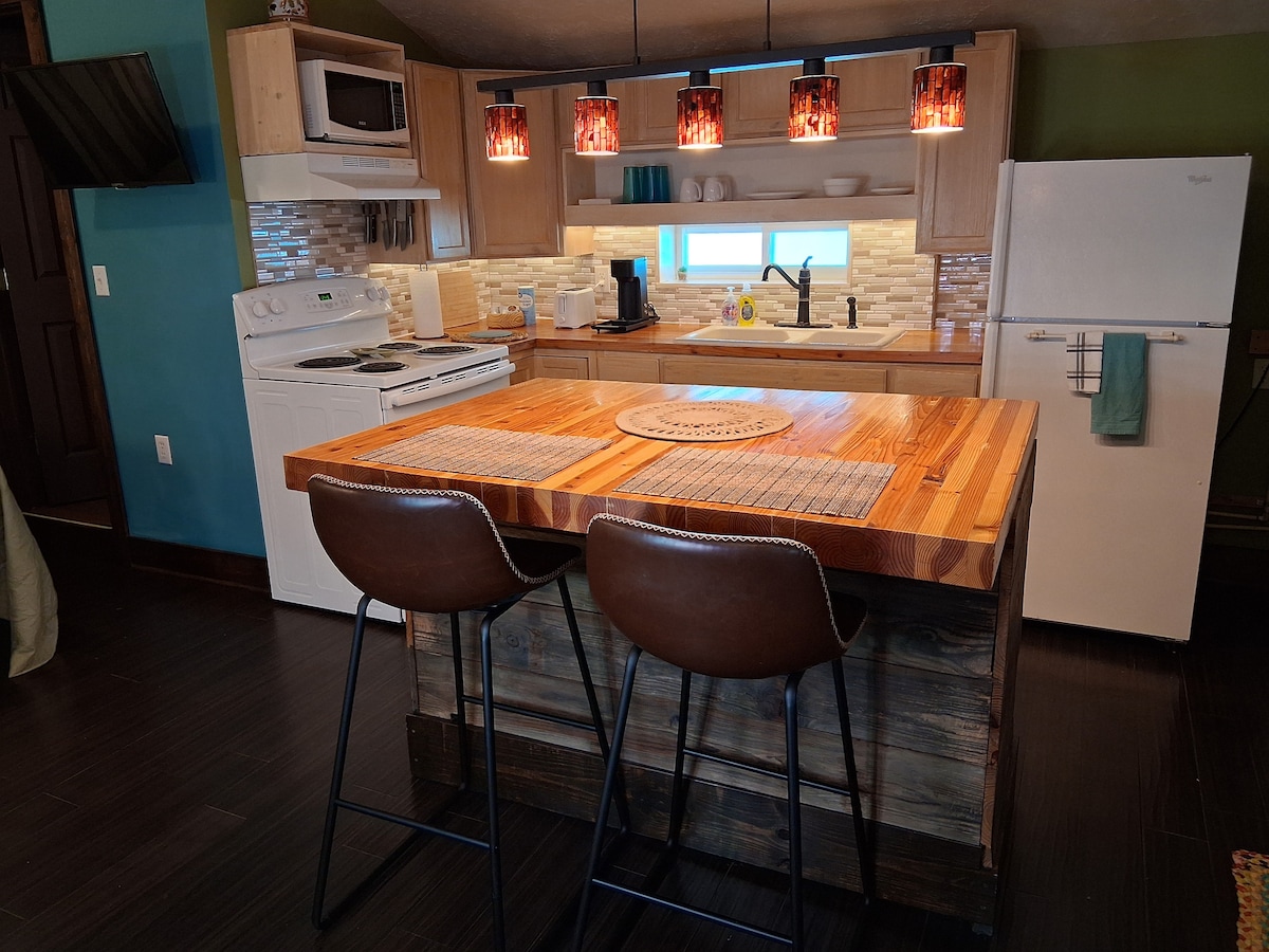 Feel at home and relax from your travels in our unique and peaceful efficiency. One block from the iconic Route 66 and within walking distance to the famous U Drop Inn, featured in the Cars movie. Cabin M features a full kitchen with coffee and cookware, full bath, a queen size bed, a washer and dryer. The large closet has plenty of space for hanging clothes, with iron and board. Large 55 inch TV with Roku in seating area, and 32 inch TV with Roku and DVD player for watching in bed. Free Wi-Fi.