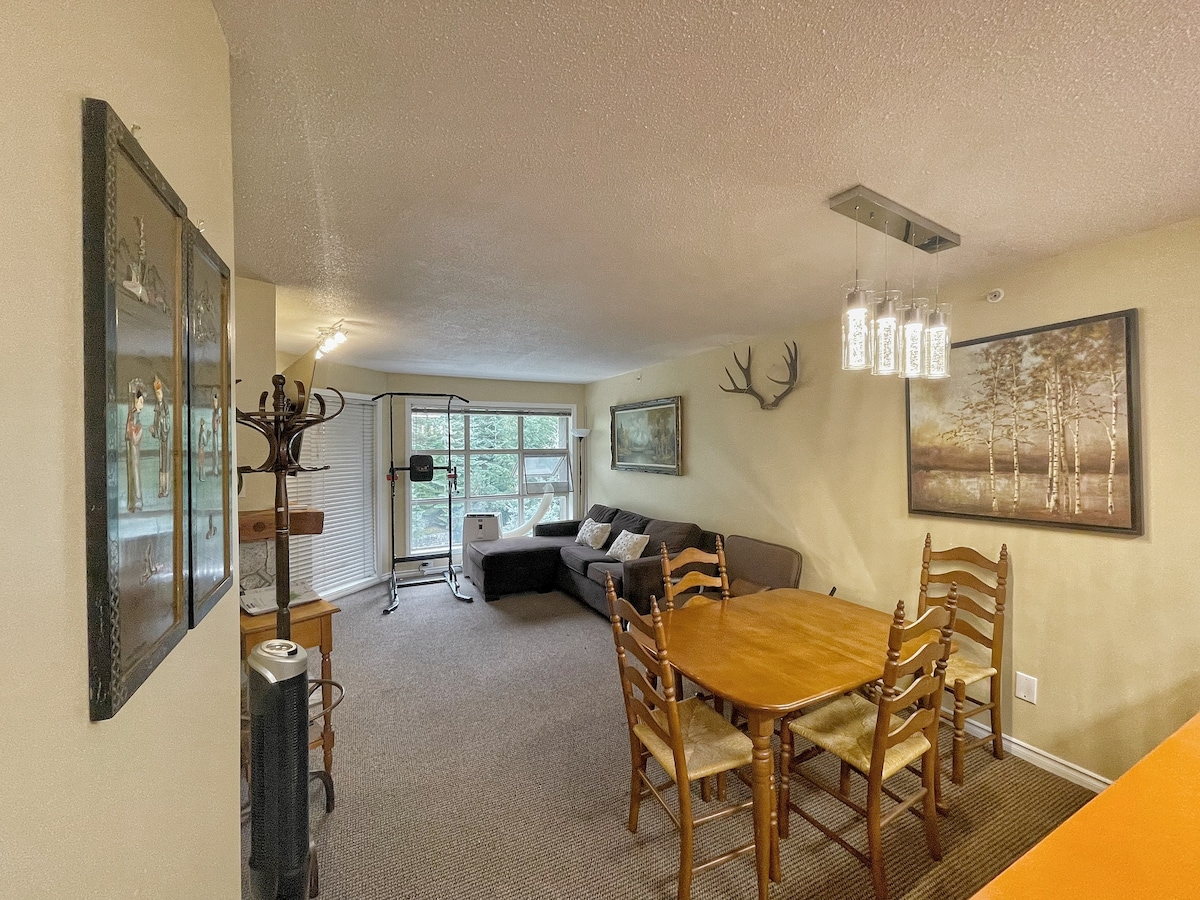 SUPER CENTRAL LOCATION IN WHISTLER'S UPPER VILLAGE (BENCHLANDS) Spacious and modern 1 bedroom condo in the Upper Village in Whistler. Ski-in/ski-out, bright and clean with beautiful forest views (2nd floor). Fire place, free parking, wifi, seasonal pool and hot tub. Free shuttle. Everything you need to relax and feel cozy after a day of adventuring. Amenities 5-15 minute walk: Blackcomb gondola (5 mins), biking and walking trails, lakes, restaurants, cafes, liquor stores and grocery stores.