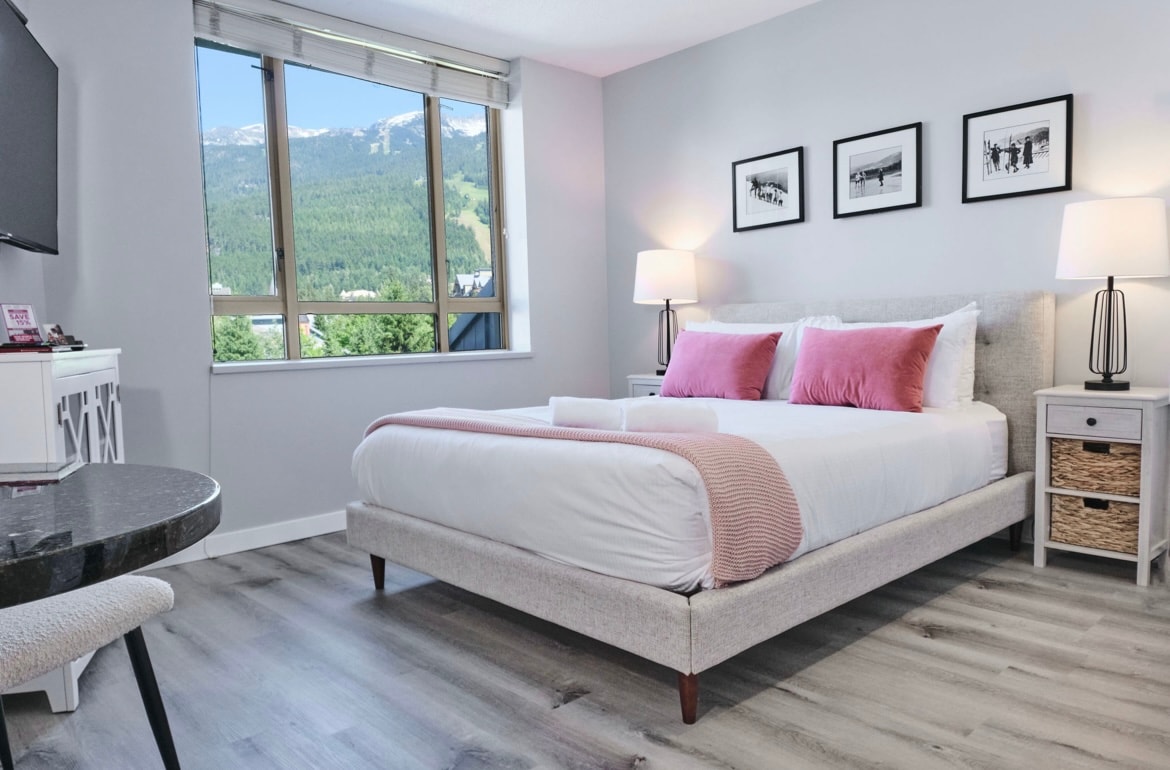 Welcome to your mountain oasis. A 1 min walk from the Blackcomb lift! Our modern condo is a bright, spacious 1 bedroom with wrap around windows for perfect tree-lined and mountain views. Look right up Whistler mountain while sipping coffee from your kitchen table! The suite has it all: - king bed - sofa bed - full kitchen - soaker jet tub - Keurig - Bose speaker - central A/C - upgraded July 2025 The building has a gym, laundry, pool and outdoor hot tub.