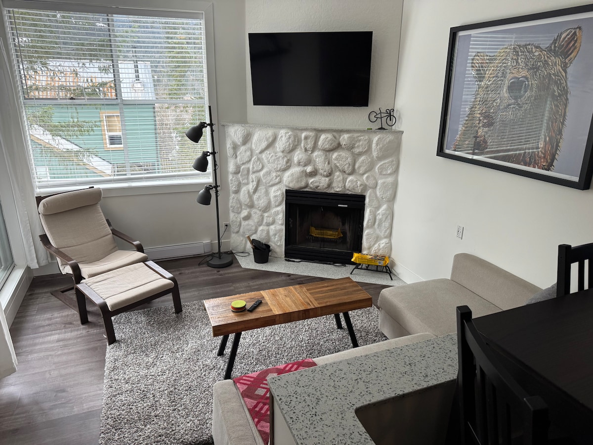 Not cookie cutter! Modern, RENOVATED, bright, open layout. Steps to everything in the Village yet just far enough from the hustle and bustle to ensure good night's rest. 9ft ceilings, large windows, gas fireplace + hardwood floors throughout. Bedroom features a Kingsdown mattress + living new (2024) sofabed (high density) paired w/ high quality duvets/linens. Large patio w/ Weber BBQ. 4k TV in living AND bedroom w/ Cable/Netflix/wifi, FREE secured parking, laundry, 13min walk or bus to lifts.