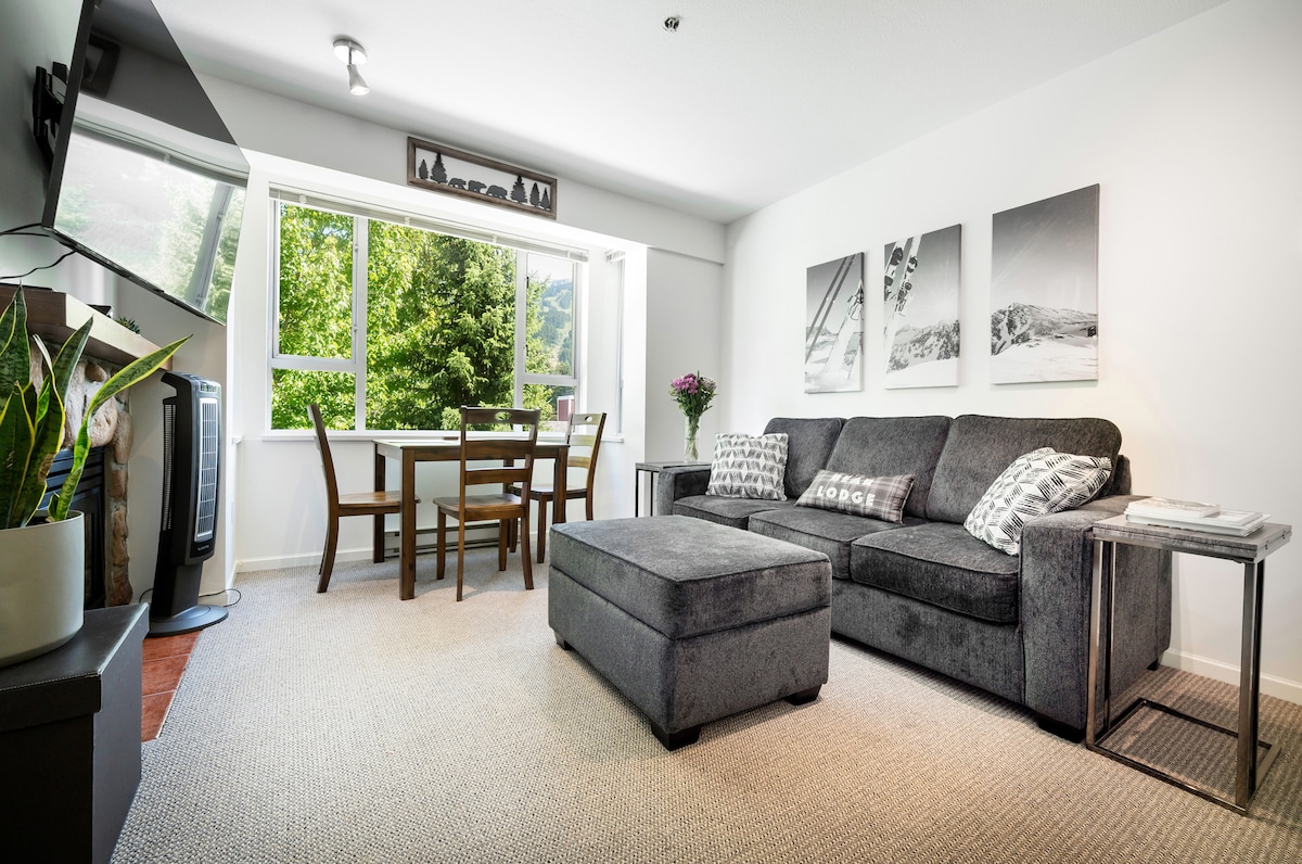 Modern Scandi 1 bd in quiet Creekside. 3 min walk to Gondola. Adjacent to the Valley Trail. Heated floors, Rain shower, 50" Smart TV, High-Speed Wifi, Fireplace, Private Ski Rack & FREE parking. Creekside Village across the street for bike rentals, groceries, gym...Choose from fine dining (Rimrock, Red Door, Mekong), comfort food (South Side, Creekbread), pubs ( Roland's, Dusty's) and cafes (BReD, Rockit). 7 min drive/ bus ride to Main Whistler Village. Public transit is 2 minutes from door.