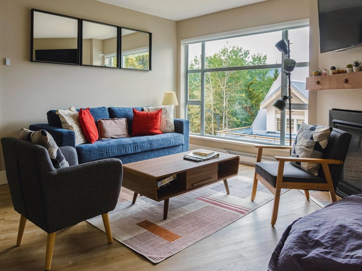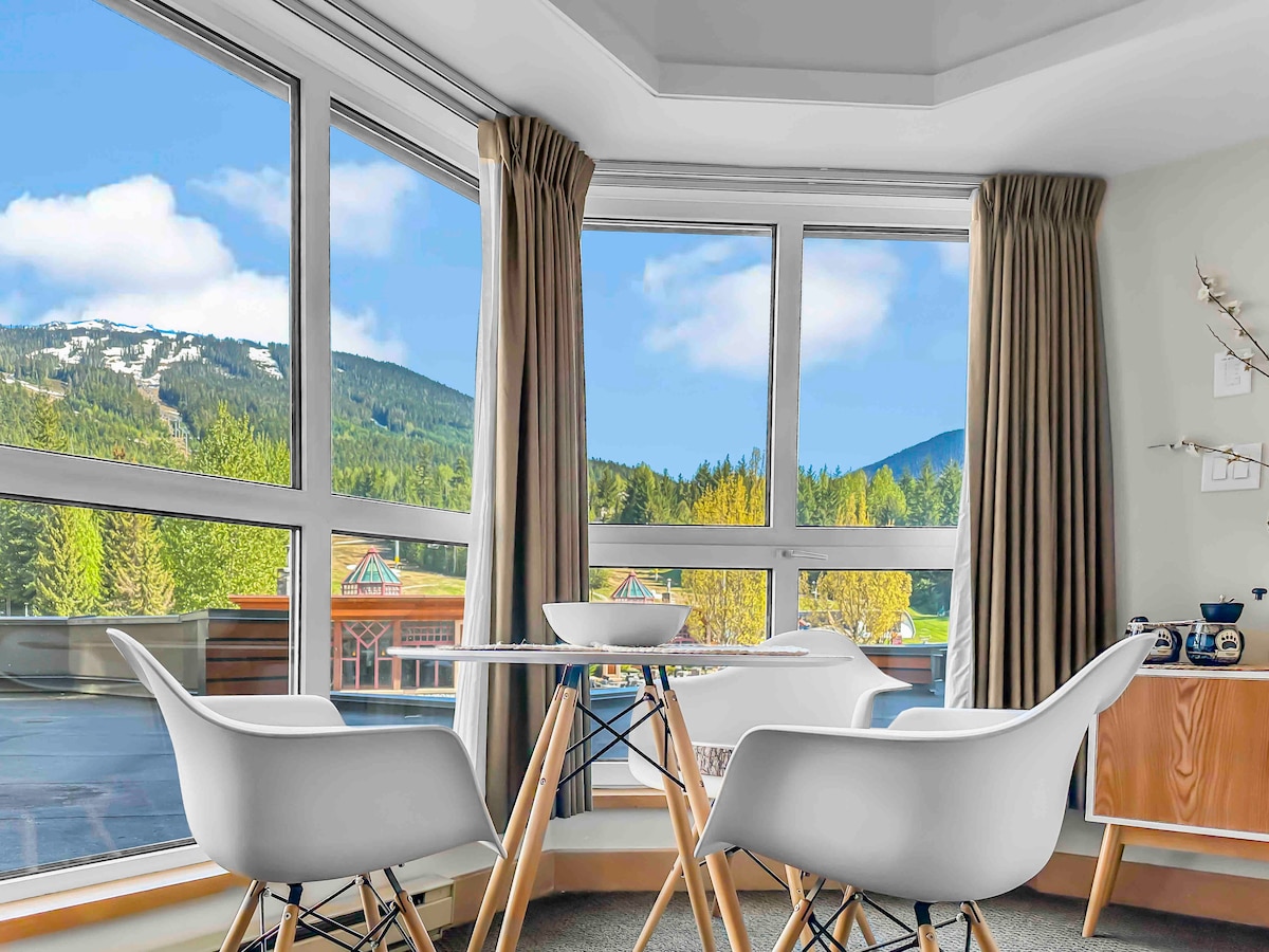 Welcome to your mountain oasis. A 1 min walk from the Blackcomb lift! Our modern condo is a bright, spacious 1 bedroom with wrap around windows for perfect tree-lined and mountain views. Look right up Whistler mountain while sipping coffee from your kitchen table! The suite has it all: - king bed - sofa bed - full kitchen - soaker jet tub - Keurig - Bose speaker - central A/C - upgraded July 2025 The building has a gym, laundry, pool and outdoor hot tub.