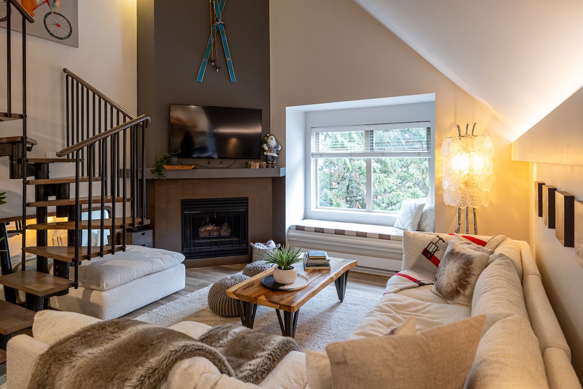 Modern Scandi 1 bd in quiet Creekside. 3 min walk to Gondola. Adjacent to the Valley Trail. Heated floors, Rain shower, 50" Smart TV, High-Speed Wifi, Fireplace, Private Ski Rack & FREE parking. Creekside Village across the street for bike rentals, groceries, gym...Choose from fine dining (Rimrock, Red Door, Mekong), comfort food (South Side, Creekbread), pubs ( Roland's, Dusty's) and cafes (BReD, Rockit). 7 min drive/ bus ride to Main Whistler Village. Public transit is 2 minutes from door.