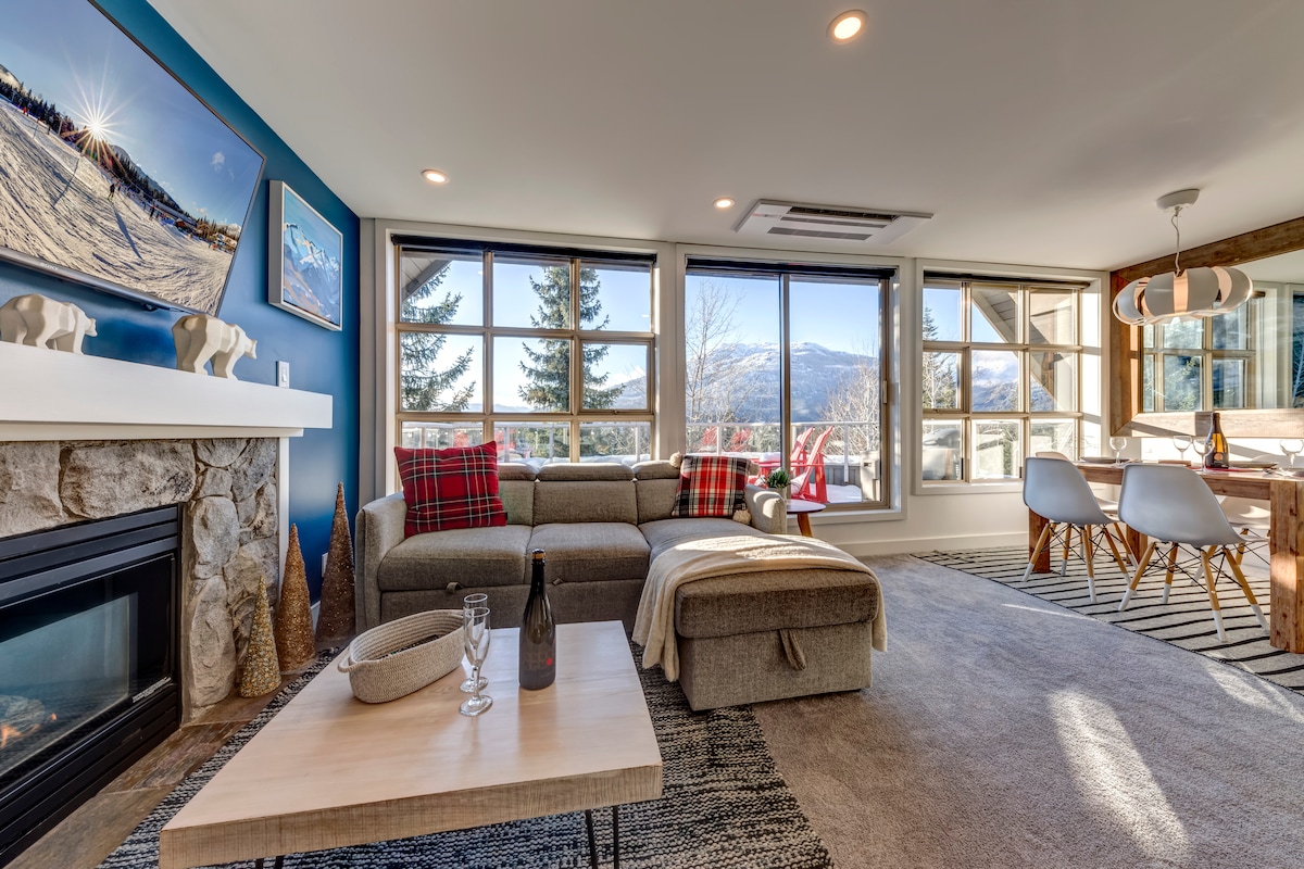 Welcome to your mountain oasis. A 1 min walk from the Blackcomb lift! Our modern condo is a bright, spacious 1 bedroom with wrap around windows for perfect tree-lined and mountain views. Look right up Whistler mountain while sipping coffee from your kitchen table! The suite has it all: - king bed - sofa bed - full kitchen - soaker jet tub - Keurig - Bose speaker - central A/C - upgraded July 2025 The building has a gym, laundry, pool and outdoor hot tub.