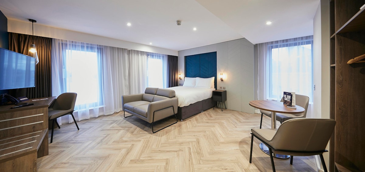The Smart Studio at Roomzzz Aparthotel York offers a compact and modern space, ideal for short stays. Measuring approximately 22 square meters, it features a comfortable king-size bed, a sleek en-suite bathroom, a fully equipped kitchenette, and a practical workspace. This well-designed studio provides everything you need for a convenient and comfortable stay.