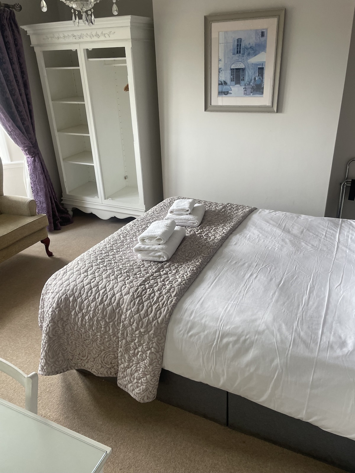 The Rose Room - A versatile room with a king-size bed and single day bed plus space to add an extra single, if required. Has an en-suite bathroom with shower. The room is decorated with pink roses and has blush pink accessories. Situated on the 2nd floor with views of the quiet street below. Includes a TV, hospitality tray, hair dryer, linen and towels. Why not add our continental breakfast in bed to your stay? Just £5.95 pppn and everything is individually wrapped so can be enjoyed later.
