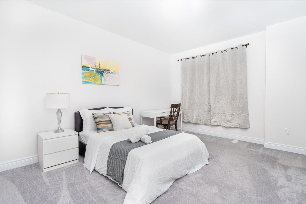 This stylish place is here for you!!It is a basement with a separate entrance, peaceful environment. It is perfect for group trips of 4 people. We do have a crib for a baby as well. The place has a laundry (Washer & dry) machine, parking spot, closer to Metro, Walmart, food basics, no flills, costco, restaurents,parks, beaches, and it's 5 minutes driving to highway 401, Electric charger around too. 40 minutes to Toronto downtown when using highway 401 Or Go train. Light breakfast included.