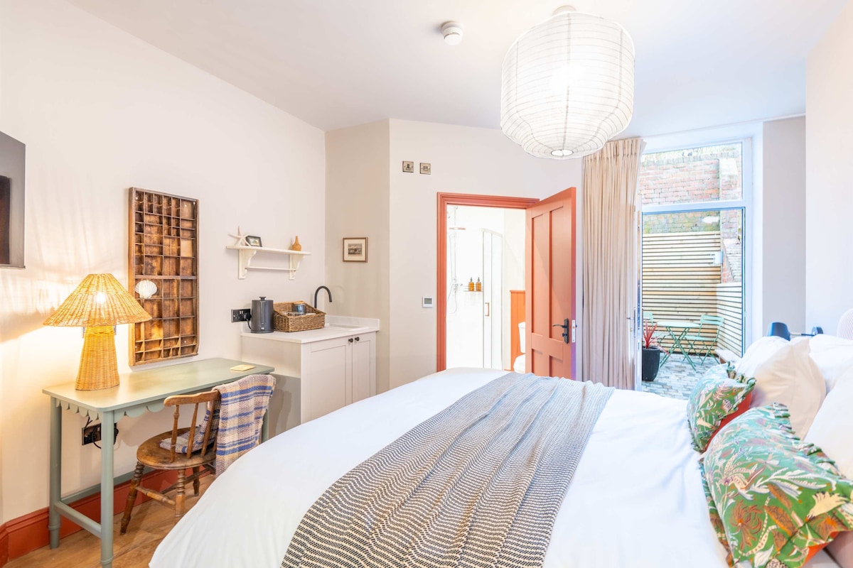 A beautiful couples room on the corner of the building with views over the beach out to sea from one window and across the harbour to St Mary's church from the other. It has a king size double bed and sitting area with table chairs and big smart TV. There is a refreshment counter with fridge, sink, and kettle and it comes with a new ensuite shower room. This 3rd floor room newly renovated is modern with beautiful decor. Included is a continantal breakfast of cereals, juice, tea/coffee