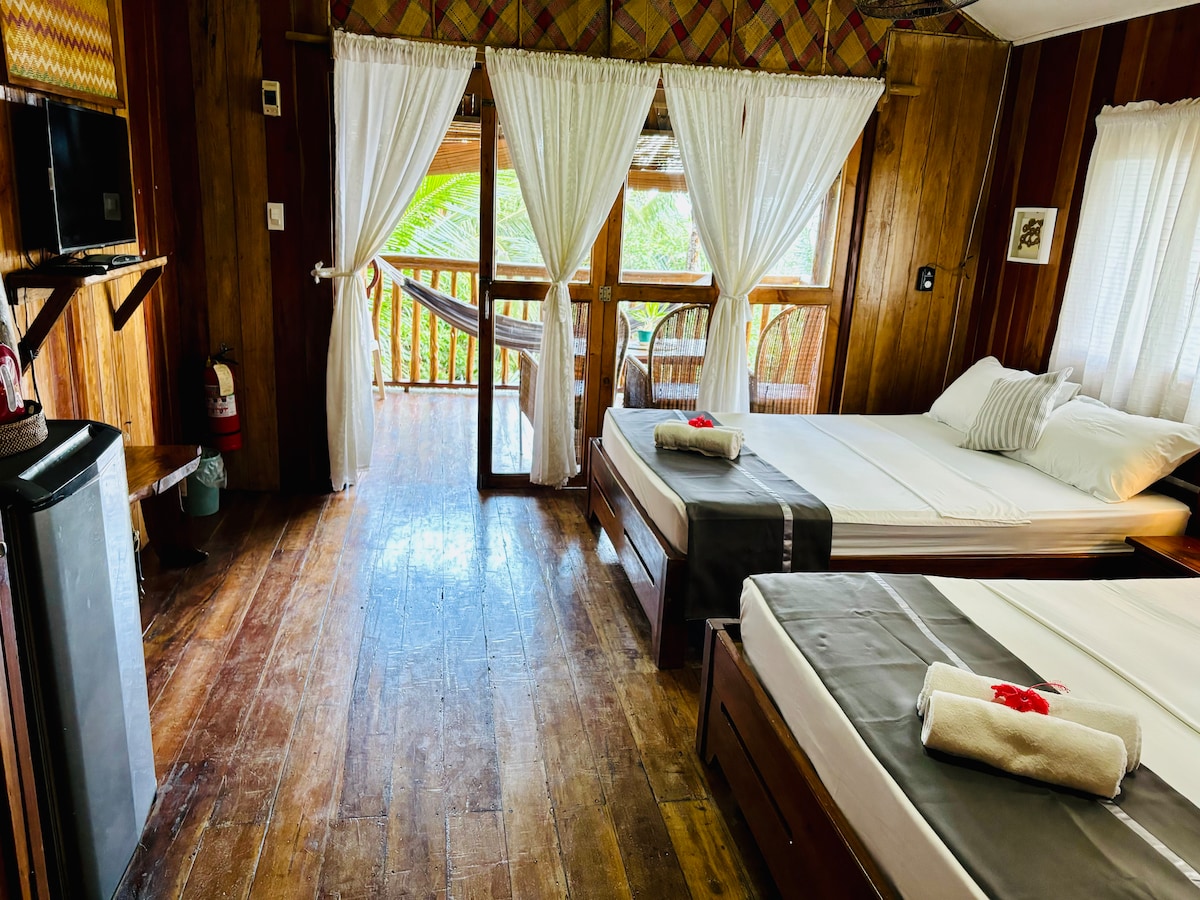 The Honeymoon Suite with Ocean View Bungalow is with free breakfast, 2 Queen bed, hot and cold shower, toilet, Air-conditioning, fans, accessible by stairs, satellite Television, bar fridge, balcony, bath towels, toiletries, shampoo & soap. All guest can enjoy our Cabana in the sea side. We serve foods and drinks with plenty of choices in our menu. This secluded beach is Ideal for adventure, swimming, snorkeling, diving and experience the village life in the beach.