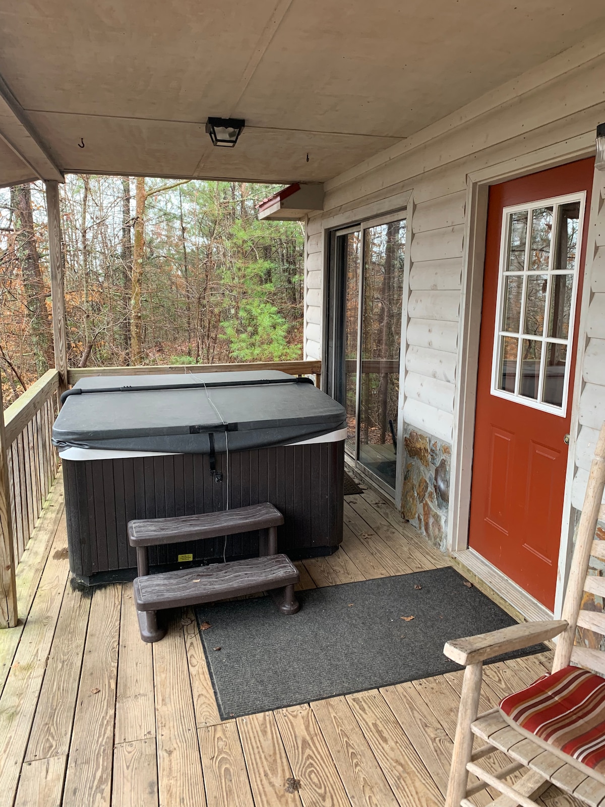 Take a break and unwind at this peaceful oasis. Mountain Time has a romantic setting to enjoy a nice long weekend . On the screen porch we have a private hot tub and sitting area to enjoy a nice meal. We have a tv that you can watch from the living area, dining area or swivel around to watch from the bedroom or while soaking in the jacuzzi. Wood burning fireplace with complimentary wood. Very comfortable king bed with a memory foam mattress that is absolutely amazing !