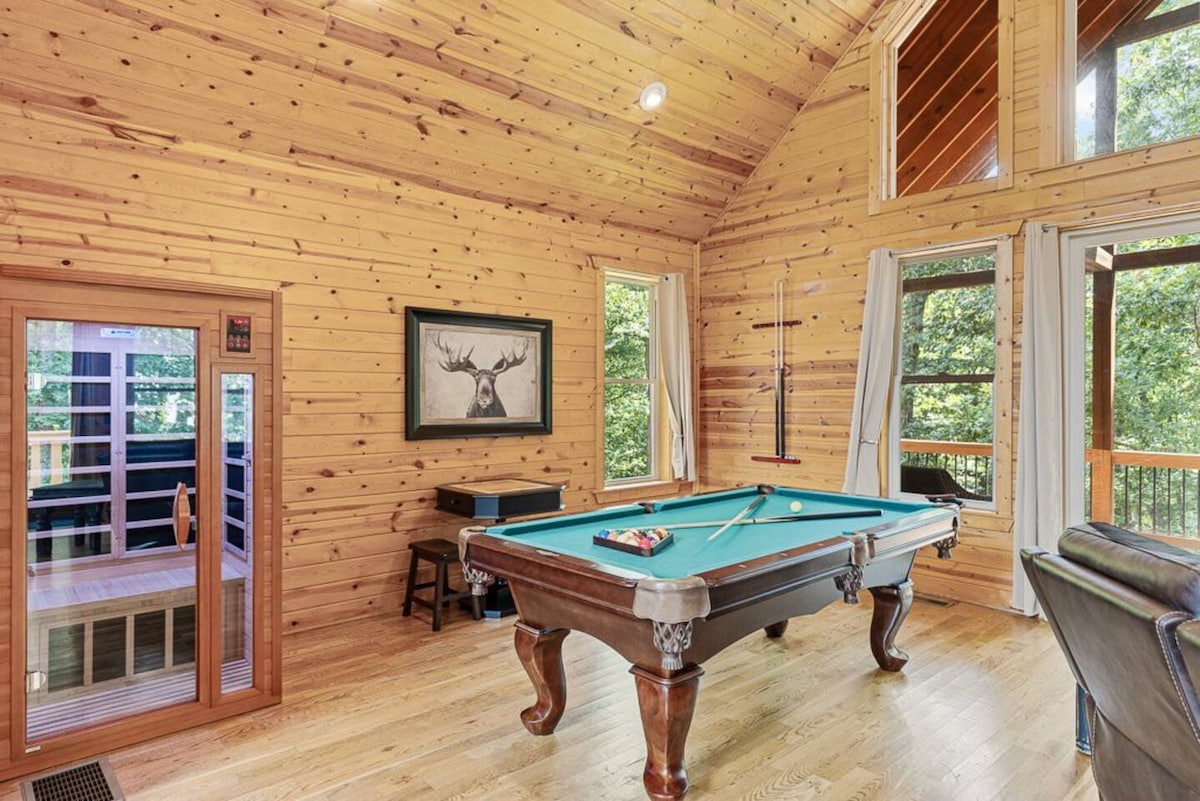 Highland Cabin, A Dream in the Mountains. Come and relax during your needed vacation and destress in the mountains just minutes from Helen, Georgia. This luxurious 5 bedroom, 3 full baths that sleeps 11 is ideal for those special moments with family. With a private hiking trail that leads to a stream, fireplace and grill, Highland Mountain Stargazer hammock, hot tub to relax, and an arcade and theater, this place is for everyone. It has it all and a million dollar view. See us @highland_cabin.