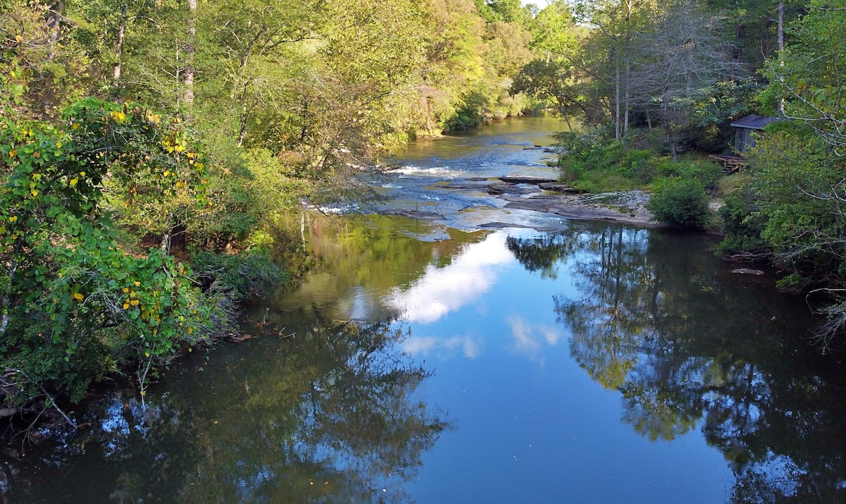 Newly renovated! Our Cottage is located smack in the the middle of North Georgia wine country, about 15 miles from Helen and Dahlonega and within 5 miles of 5 wineries. As you meander down the driveway to the cottage you are met with the sounds of the rapids of town creek that are quite literally your back yard. Sit on a rocking chair overlooking the creek with a glass of wine and let your worries drift away. Property sits on 4 lush acres and features over 300 ft of creek frontage. PARADISE!!!