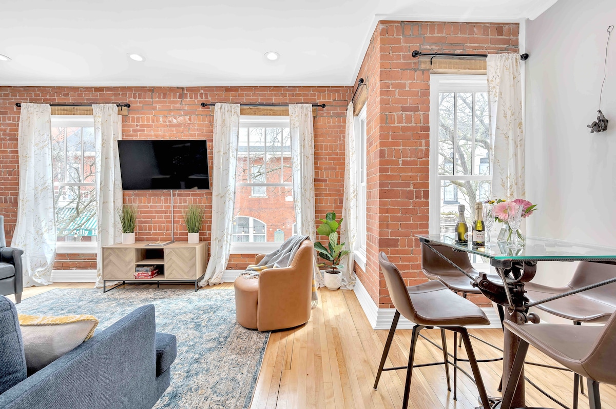 This beautiful and light filled space boasts 12 foot ceilings and exposed brick throughout. Enjoy the well appointed kitchen to cook a quick meal, or walk out your front door and enjoy a plethora of local restaurants at your fingertips! Smart TV has complimentary prime video account for your entertainment! The bedroom boasts a comfortable king sized bed with a small office nook with a desk! Enjoy views of downtown Depot Town and the train from your livingroom window!