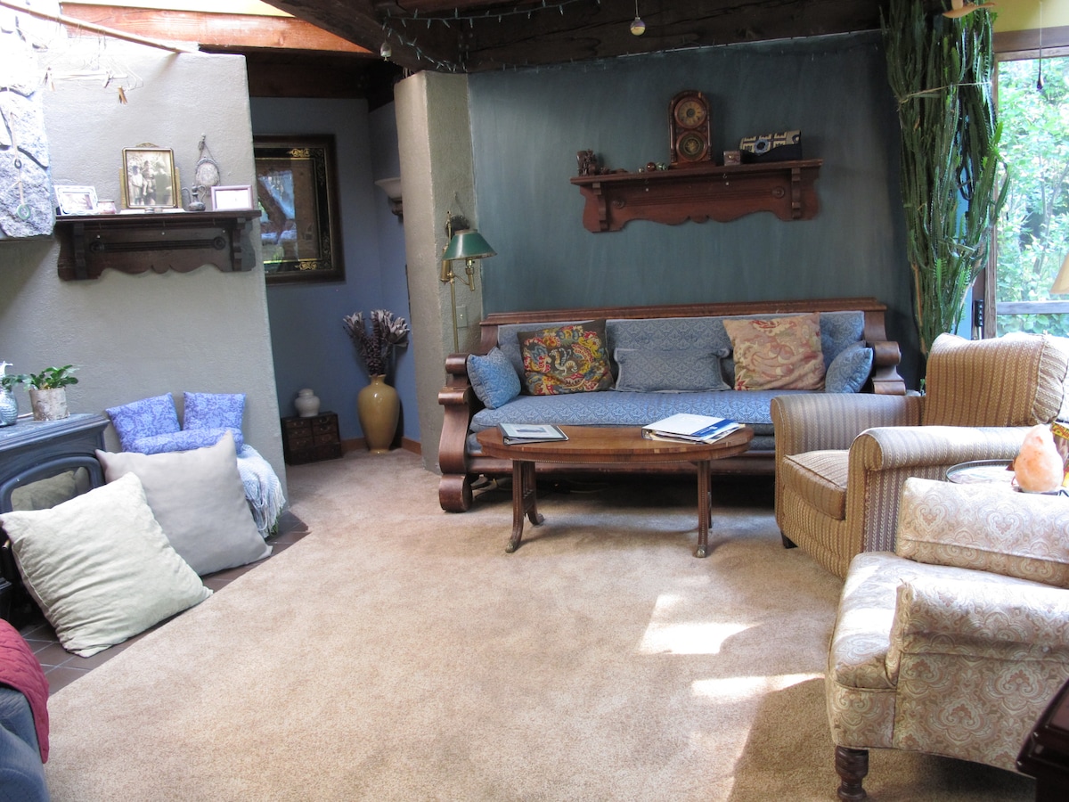 Close to heaven for artists and nature lovers. Guest space is the entire first floor of 47' round house with six foot picture windows which allow a 180 degree views on a private half mile on the Connecticut River. Extensive gardens, 30' private guest porch overlooking sandy beach and natural swimming vortex. 4 kayaks, firepit on river's edge, rope hammocks on riverbank. Northlight studio, queen bed ,and foldout couch,divided from bedroom by curtains. Small kitchenette and dining room area.