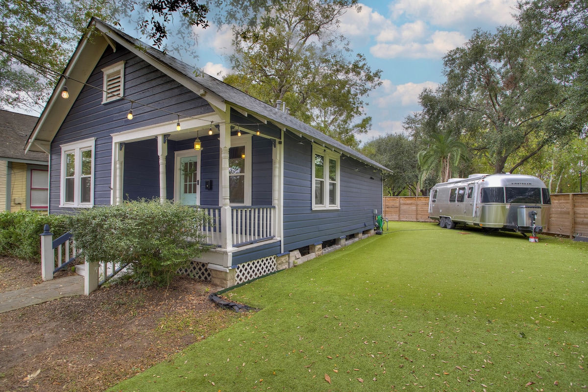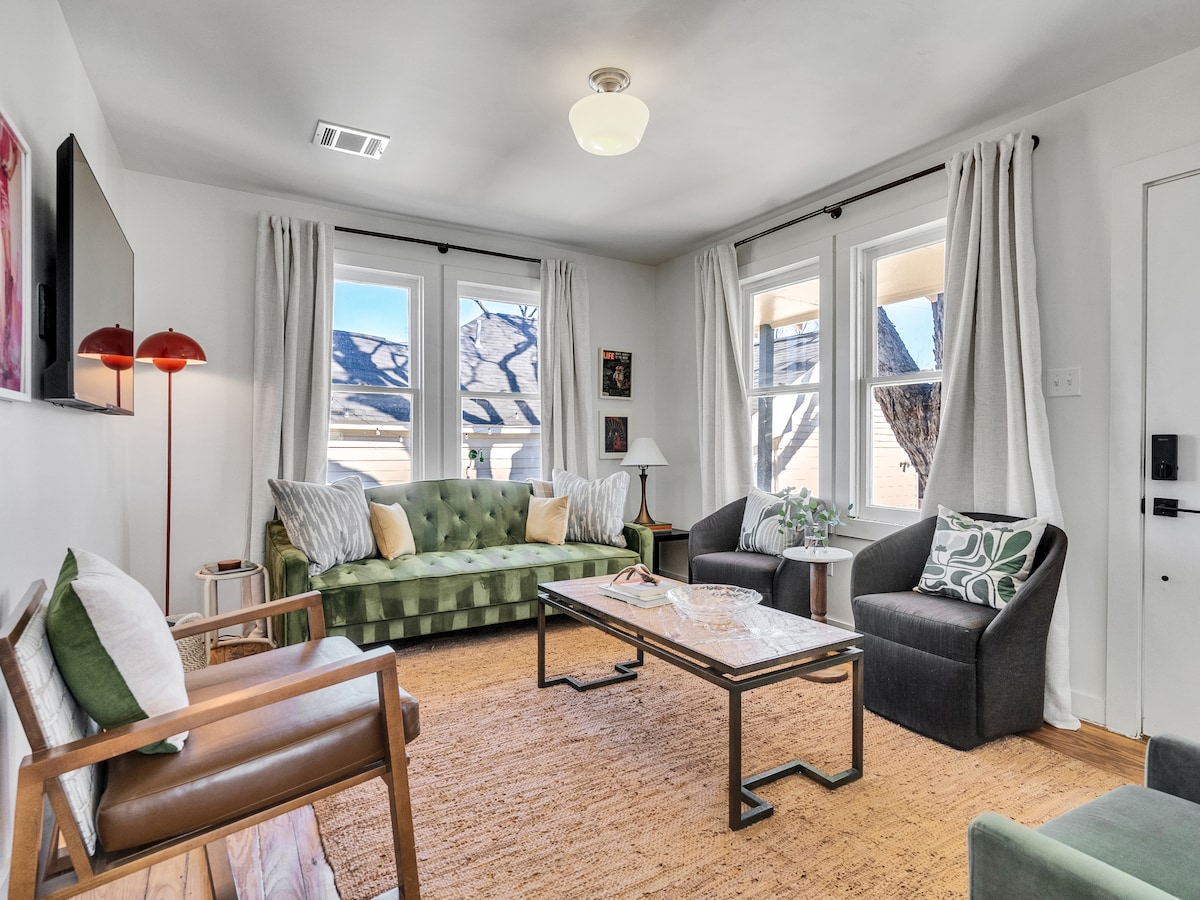 ⦿ Pet friendly! (fee in addition to rsrv. total req.) ⦿ Walk to coffee shops, restaurants & bars. ⦿ Secure covered parking. ⦿ Gigabit internet and 32” 4K monitor. ⦿ 77” 4K OLED TV with Sonos surround. ⦿ Spacious and fenced back yard. ⦿ 5 minute drive from downtown. ⦿ Quiet residential neighborhood. ⦿ Level 2 EV chrg. station 2 blocks away. Relax in my cozy, 100 yr old, craftsman bungalow located in the historic neighborhood: “Woodland Heights”