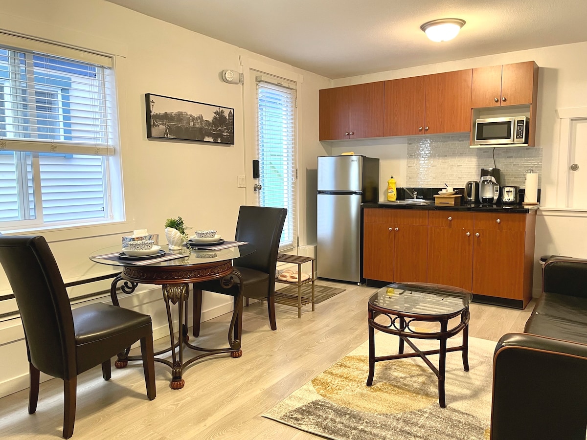 Licence26072;Registration#H686681710 Central located independent suite has a separate entrance from the house. 9mins walking distance to bus station, 15 mins walking to beach, 12 mins walking from shopping center. This suite includes 1 bedroom with 1 QUEEN bed; 1 living room with a leather sofa, TV with Netflix, and small kitchen; 1 bathroom. Free WIFI, coffee and tea, iron, hair dryer, shampoo & body washer, Mirror. Keyless locker. 1 parking on drive way Coin laundry is 4mins driving away.