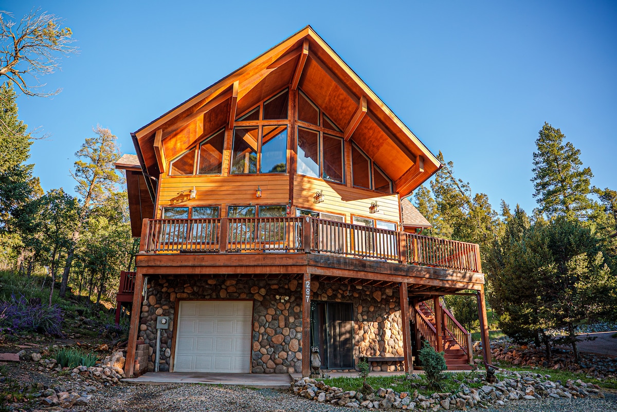 Very private mountain-top, 3-story log cabin, with 3 bedrooms/2.5 baths plus bonus room; sleeps 8. Remote yet just 13 minutes to Ski Cloudcroft (3 more to the village). Completely equipped kitchen yet spacious covered balconies for outdoor grilling while soaking in forested mountain views. Huge wall of windows in the warm and inviting living room brings the pristine forest right indoors. Loft-level master suite, 2 bedrooms below, futon in the cinema/arcade room, means space for the whole family.