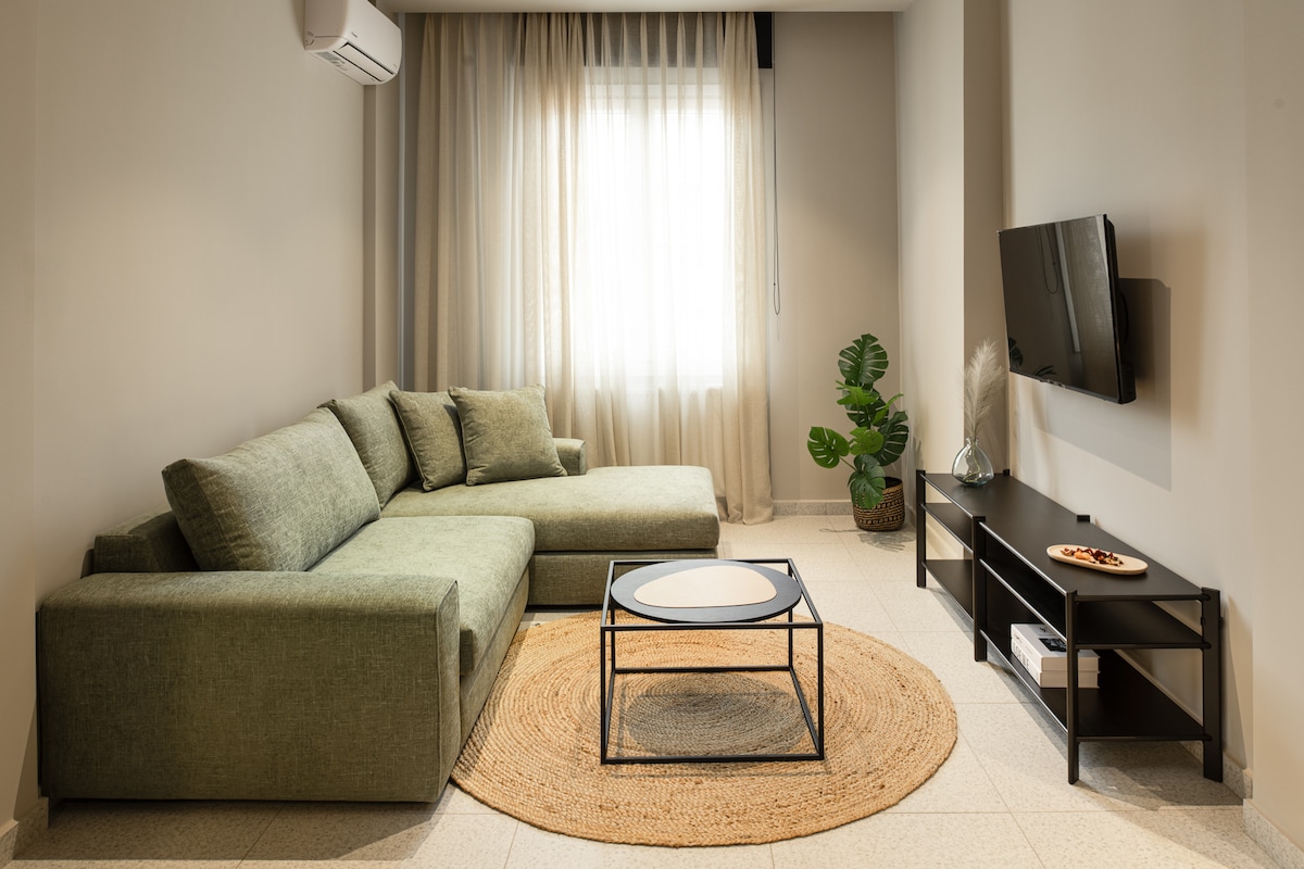 Unwind in this bright airy 65m2 apartment with soaring ceilings. Discover a peaceful 3 spaces escape right in the center city, next to Aristotelous square. Port, museums, restaurants, coffee shops, supermarkets are within walking distance! Enjoy our wifi Fiber Optic 100Mbps speed. Two aircondition units warm up the entire apartment and create a homely ambience to relax after a day visiting city sights.