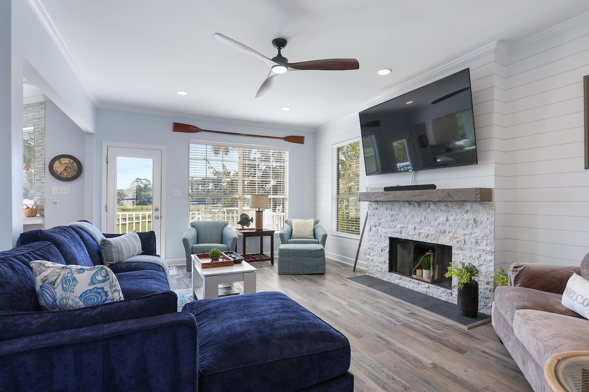 Discover our Bungalow by the Lagoon, a mid-century coastal retreat with 3 bedrooms, each with its own king bed and TV, along with 2 full bathrooms. Unwind on the covered deck with an outdoor TV or gather around the Solo Stove fire pit on the patio. A private lagoon dock offers serenity, and amenities include cable TV, a stocked coffee bar, and close proximity to grocery stores and restaurants. Equidistant from Tybee Island Beach and downtown Savannah. Your coastal retreat is waiting!