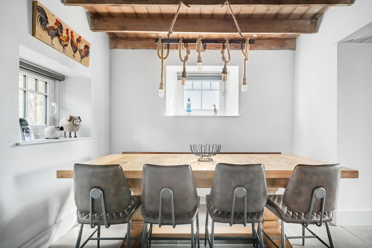 As the waves break against the golden sand the sound of the sea carries up to Dan Y Graig and with stunning views across the terrain makes a stay here magical. We hope to launch our Barn conversions by 2019 so keep an eye out for exciting progress. Dan y Graig house is a Victorian Farmhouse, so we’ve endeavoured to retain as much of the charm and character its original features provide, whilst introducing contemporary elements to update its appeal and make it more suited to today’s traveller, be it walker, surfer, or a group of friends or a family wishing to spend a few days in coastal luxury. The narrow lane that winds up to the farm is a little rocky in places. You’re climbing the mountain don’t forget, but it’s worth it! Views from Dan y Graig are breath-taking, looking out directly towards St.Davids over the city golf course and then down to Whitesands beach, only 300 yards away, and of course out to the sea, Ramsey Island and the Smalls Lighthouse! Together with the magnificent backdrop of Carn Llidi mountain and the incredible coastal path providing an unbeatable setting. The spacious farmhouse accommodates up to eight guests between its four stylish bedrooms – two King rooms, a double and a twin. Each bedroom provides luxurious Goose feather and Duck Down bedding, Egyptian cotton linen and Laura Ashley towels. The bedroom near the sea will be made up using synthetic pillows and duvet just in case someone has an allergy to natural fillings. Styled in clean and bright white with warm grey tones and flashes of colour from the amazing accessories made locally – Tregwynt Woollen Mill blankets and cushions; Solva Woollen Mill rugs. Monochrome wall art by Solva artist Ian McDonald and colourful coastal landscapes by the renowned Pauline Beynon enrich the spaces. Whilst the bedrooms at the front are big and bright, with sumptuous large beds, the two at the back of the house are ‘loft style’ rooms which lead off their own little private stair. These offer a different experience, perfect for the kids or the guest who’d prefer a cosier, space. To maximise space, we’ve used specially designed loft beds that are a bit lower than usual, so you don’t knock your head on the beamed ceiling as you get up in the morning. The first floor bathroom has a bath with a unique view, relax in bubbles and gaze directly out to St.Brides bay and the coastal terrain. There’s also a fabulous glass power shower and the window has a double blind with a magic screen for whatever degree of privacy a guest requires. Traverse the levels of the house via the old staircase, finished with a Solva Woollen mill runner to enhance this magical space! A ‘sea-fearing’ inspired style comes together with hints of Alice in Wonderland to conjure ideas of another world. A modern chandelier of amber Edison light bulbs hanging like teardrops from the sky inspires the imagination. The ground floor presents ample space for relaxing and entertaining. Sit and read in the cosy but more formal ‘Parlour’- lean back into the winged back chairs, recline on the tweed chesterfield and enjoy the view. Light the log stove when there’s a storm brewing outside and relish in the comfort of being safe inside where you can plan your next adventure using the ‘Twr Y Felin’ guide to St.Davids map that hangs over the fireplace. This map is a wealth of knowledge and was created by my Great Great Uncle in 1923, and in fact once owned the farmhouse. Although re-printed in the eighties, the map is now hard to find. Gather with family or friends on the other side of the hall in the more relaxed family room that opens up into the dining space of the kitchen. It has a bright and modern feel, with two gorgeously comfortable tweed couches. Ideal for rainy days, the family room has a large smart tv for movie watching or enough space for board games and other family amusement. Another little log stove is convenient to top up the heat that the underfloor heating amply provides. There’s another spectacular view of the rugged landscape through the window, and you can also watch the kids play out on the front terrace. We opened this room up into the kitchen/diner to improve the quality of the space, giving a much freer flow and openness to the layout. If you’re busy in the kitchen, having dinner or relaxing in the family room, you can still be sociable. Enjoy dining together around a heavy rustic table. There’s room for eight to sit comfortably around the table and there’s an extra leaf hidden underneath it if you want extend the table should friends drop in. The chef of the house can cook using the Le Creuset equipment on the top of the range Rangemaster Range cooker – a five gas burner hob, with griddle fitting and three electric ovens should keep chef busy and plentiful food for everyone! Villeroy & Boch ‘Manoir’ porcelain tableware and Dartington cutlery enhance your dining experience indoors, and there’s a set of bamboo tableware if the weather’s amazing and you decide to eat outside. Who wants to do the washing up when you’re on holiday?! No one needs to as there’s a family size dishwasher just to make things easier. There’s also a six shelf Siemens fridge with three freezer drawers if you want to stock up and avoid a daily shop, which in Summer can be a nightmare. Many guests prefer to order online and get it all delivered to the farmhouse. Tucked behind the kitchen, just off the back hall is a unique little bathroom. It’s uniqueness comes from the quirky wet-room shower that’s been designed into the old chimney. It’s an amazing space and quite unique with an almost cave-like quality. Everyone should try it at least once during their stay! At the back door is a boot room with a large Belfast sink where you can wash your boots after a day’s walking rinse your flip-flops when you come home from the beach. Throw your laundry straight into the washer dryer here too. But before you go into the hou