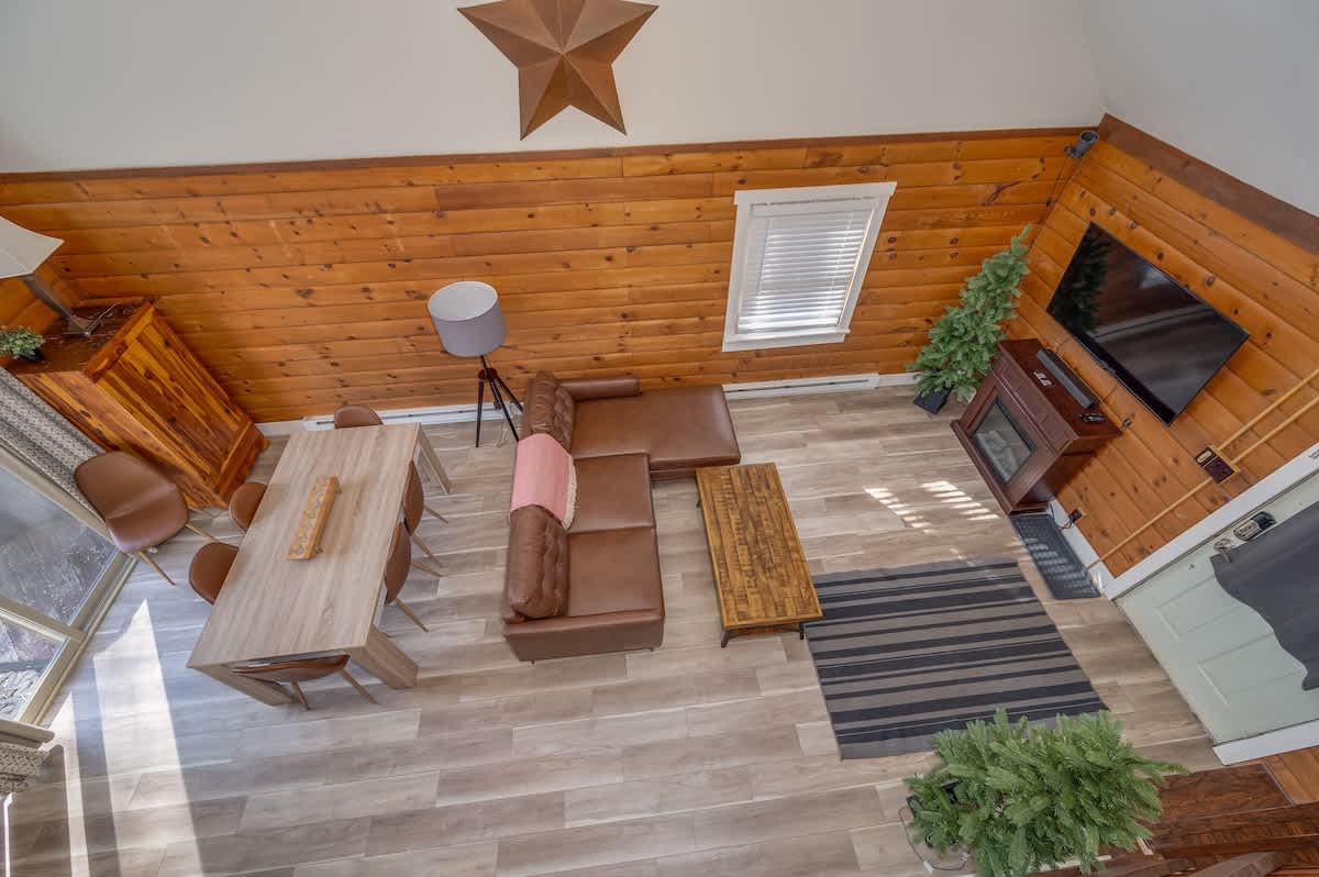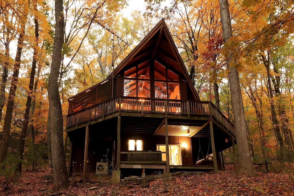 Experience the epitome of luxury in our breathtaking A-frame cabin, nestled amidst the serene woods. This modern retreat offers lavish amenities and a stunning open living space with floor-to-ceiling windows, immersing you in nature's beauty. Indulge in the private hot tub, relax by the fire pit, and unleash your culinary skills in our fully equipped kitchen. The large screened porch provides a tranquil oasis, while nearby hiking trails, golf courses, and a spa offer an unforgettable getaway!