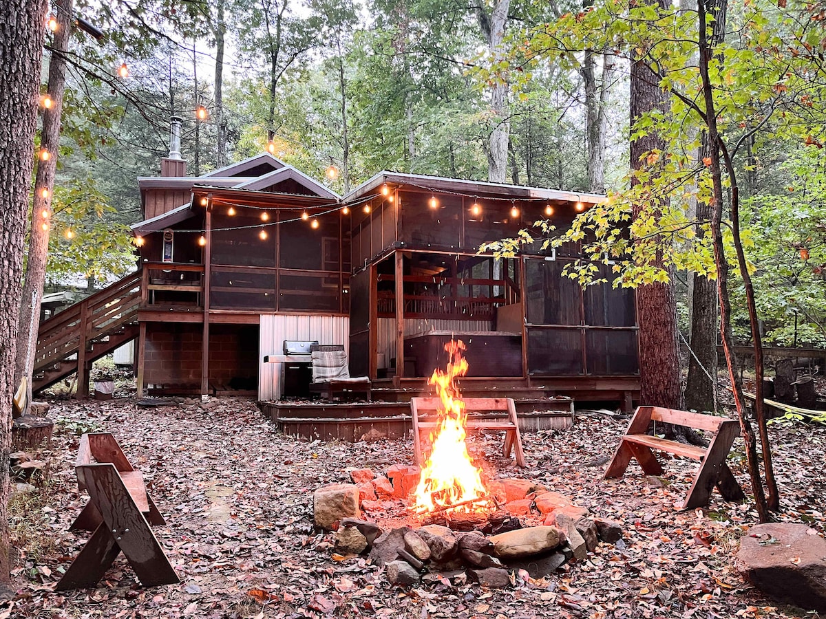 Experience the epitome of luxury in our breathtaking A-frame cabin, nestled amidst the serene woods. This modern retreat offers lavish amenities and a stunning open living space with floor-to-ceiling windows, immersing you in nature's beauty. Indulge in the private hot tub, relax by the fire pit, and unleash your culinary skills in our fully equipped kitchen. The large screened porch provides a tranquil oasis, while nearby hiking trails, golf courses, and a spa offer an unforgettable getaway!
