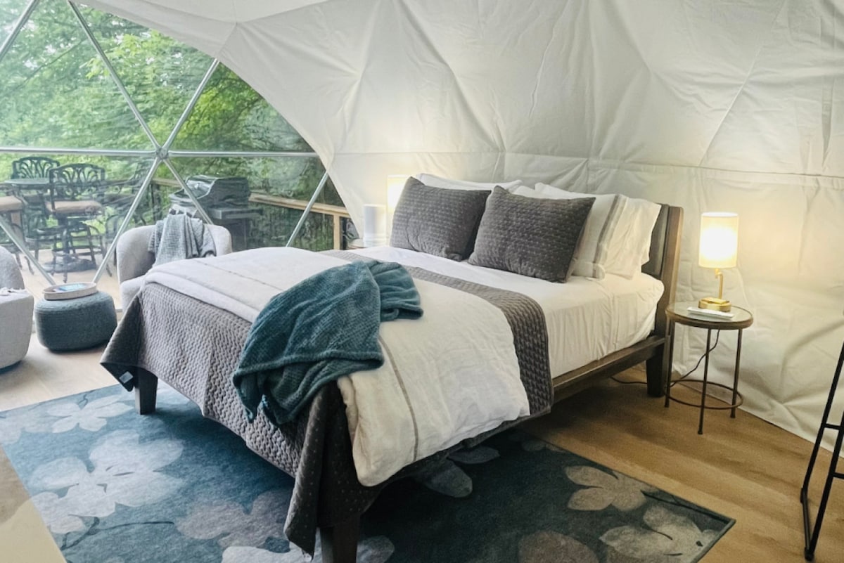 Unplug & reconnect with nature. The Dome is nestled on our farm's off-grid hilltop. Tremendous mountain views, peace, and animals to visit! This is CAMPING, elevated with comforts. We provide the climate controlled dome, comfy bed (BYO sheets), griddle, and basic supplies. You bring: Queen size bedding, drinking water, cooler, & firewood. Outdoor shower OPEN till October 1st. Laundry room, wifi bar, & camp store OPEN Enjoy trails, farm animals, & seasonal flowers & veggies to pick.