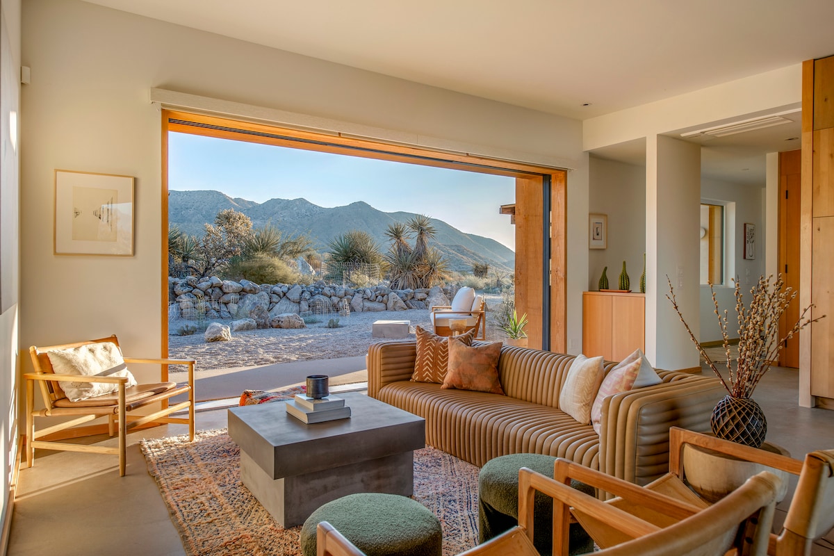This serene Desert Oasis sits at the top of the Spa Zone, offering sweeping mountain views and total tranquility. Soak and stargaze in the spa, unwind beneath dramatic outdoor lighting, and enjoy fully gated privacy surrounded by lush landscaping. Walk to local spas, a museum, and nearby dining, or hike directly across the street. Perfectly located between Joshua Tree and Palm Springs, in an area famed for healing hot springs and located within a powerful positive energy vortex.