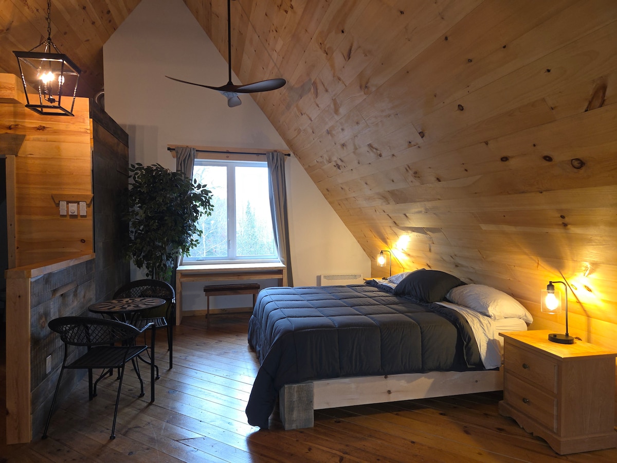 Immerse yourself in the tranquility of nature at our Prunella No. 1 cottage, an A-Frame cabin with striking architecture and thoughtfully designed interior, located in a 75-acre forest sanctuary, merely a bit over an hour's drive from Gatineau/Ottawa. With shared lake access, private cedar hot tub, indoor hammock, wood stove, and radiant in-floor heating, Prunella No. 1 sets the bar for a memorable getaway. CITQ: # 308026