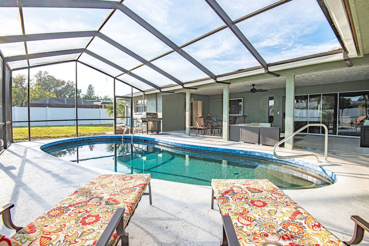 Escape to Paradise Palms, a tropical, well equipped home with lots of room for fun and relaxation. Close to Siesta+Lido beaches! 5 miles to IMG +14 miles to AMI! This spacious property boasts a great layout for groups including a large dining area with seating for 8 comfortably and a fully equipped kitchen. Step outside into the fully screened lanai area with a lounge area with a 60'' TV, dining table with seating for 6, fenced yard and a large pool with plenty of pool toys for your enjoyment.