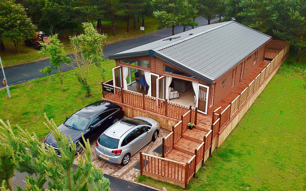 Forest View is a beautiful, luxury, very large modern lodge. She has everything you need for a home from home experience whilst you enjoy your stay. With a private hot tub, large decking area with dining table, WiFi, Sky TV, fully fitted kitchen and utility room, massive open plan living area, 3 large bedrooms and all situated on a lovely plot on the edge of a wood. There is parking for two cars and a bar restaurant, large picnic area, short woodland walks and a lake to enjoy on the park.