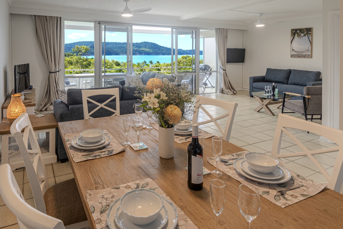 Take a break & unwind at this peaceful island retreat. Fully renovated (August 2023) modern 1 bedroom fully self contained apartment perfect for couples with views of the Whitsunday Passage. Sunsets are spectacular! Bedroom - king size bed & 2 balconies. Brand new modern kitchen & laundry. Comfortable 3 seat electric recliner lounge with tv and netflix subscription makes evenings a time to relax and unwind. BBQ, dining & deck chairs on the balcony draw you out to a tropical paradise.