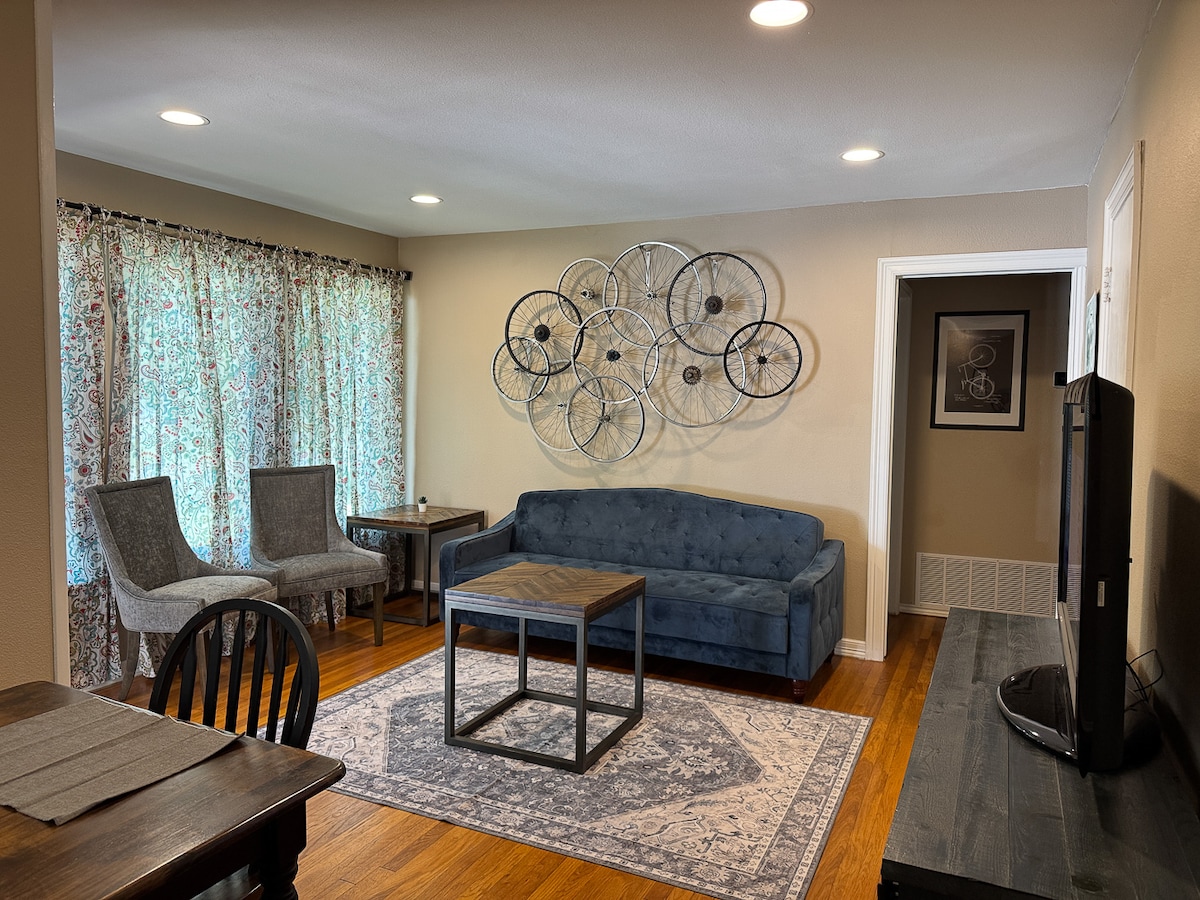 Come relax and stay in our home that offers all there is to have in a prime central location just steps away from Midwestern State University and minutes from downtown. Tastefully decorated with an eclectic, vintage ambiance including quirky pieces and interesting lamps. Fully fenced-in backyard (chain link) with outdoor lounging furniture, propane grill, and a fire pit area to enjoy an evening by the fire. We look forward to your stay with us!