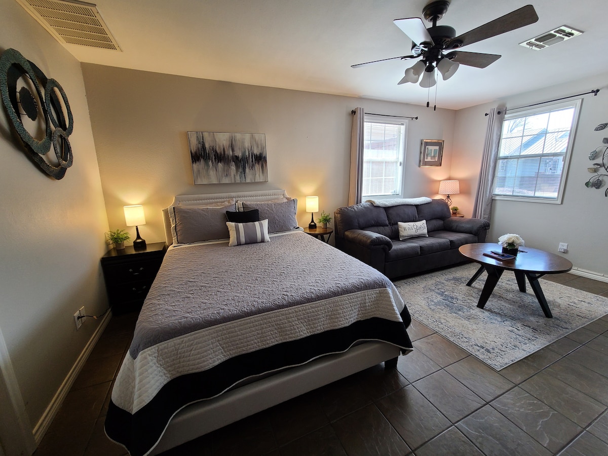 Settle into our cozy standalone guesthouse with a comfy queen bed, kid-friendly sofa bed, and 46" TV with all your favorite streaming apps. Enjoy a kitchenette with a mini-fridge, microwave, and Keurig, plus reliable wifi for everyday use (no Ethernet/wired connection available). Easy self check-in, free parking, and a great location near Sheppard AFB, MSU, the hospital, and downtown restaurants and shops.