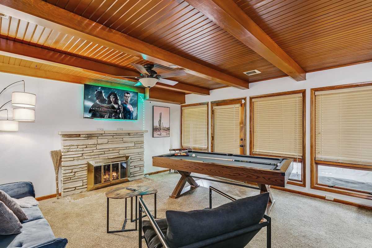 Welcome to Crestline Ranch, a one-of-a-kind mid-century escape for lovers of art, culture, and quiet moments with a good book. Vintage finds and collected treasures fill the home with warmth and character, while a folksy speakeasy hides behind a bookcase. Relax in the year-round hot tub, gather around the firepit, or enjoy outdoor hangs and photo-worthy moments by the vintage camper.