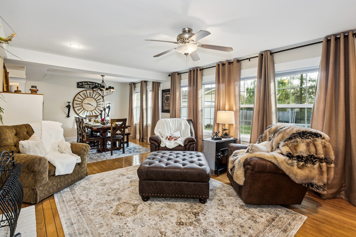 Classic Craftsman Charm For Convening: Safe, Spacious, Scenic & Serene. We offer a pet friendly, 3300 sq ft custom built craftsman style house, with modern amenities. Located in a picturesque, safe & quiet community. Master bedroom has a king bed. Bedrooms on the main floor have full sets & twin bed. Downstairs bedroom has queen, full size, & twin beds. All bedrooms on main floor have walk-in closets. All beds have memory foam mattresses w/ encasements, including encasement pillows.
