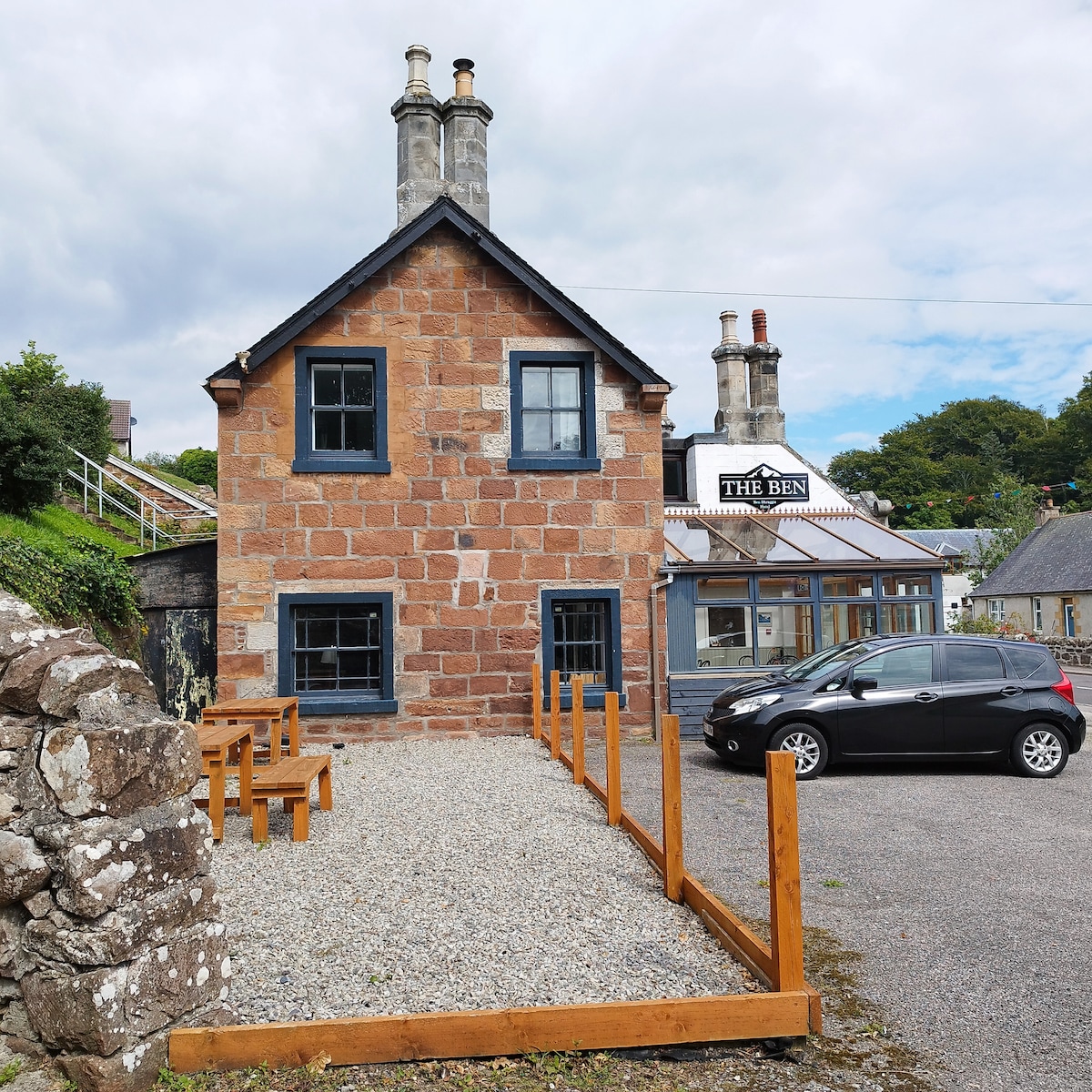 The Ben provides a relaxed, peaceful atmosphere with easy parking and large dining and social spaces. It is situated on the doorstep of Dunrobin Castle, The Big Burn and Loch Fleet. Ideal stop for Golf enthusiasts, NC500 and LeJog adventurers. The Ben, originally the Ben Bhraggie Hotel, is operating on a B and B basis only, offering a light continental breakfast. The common areas provide facilities for relaxing, socialising and also doubles as a quiet workspace.