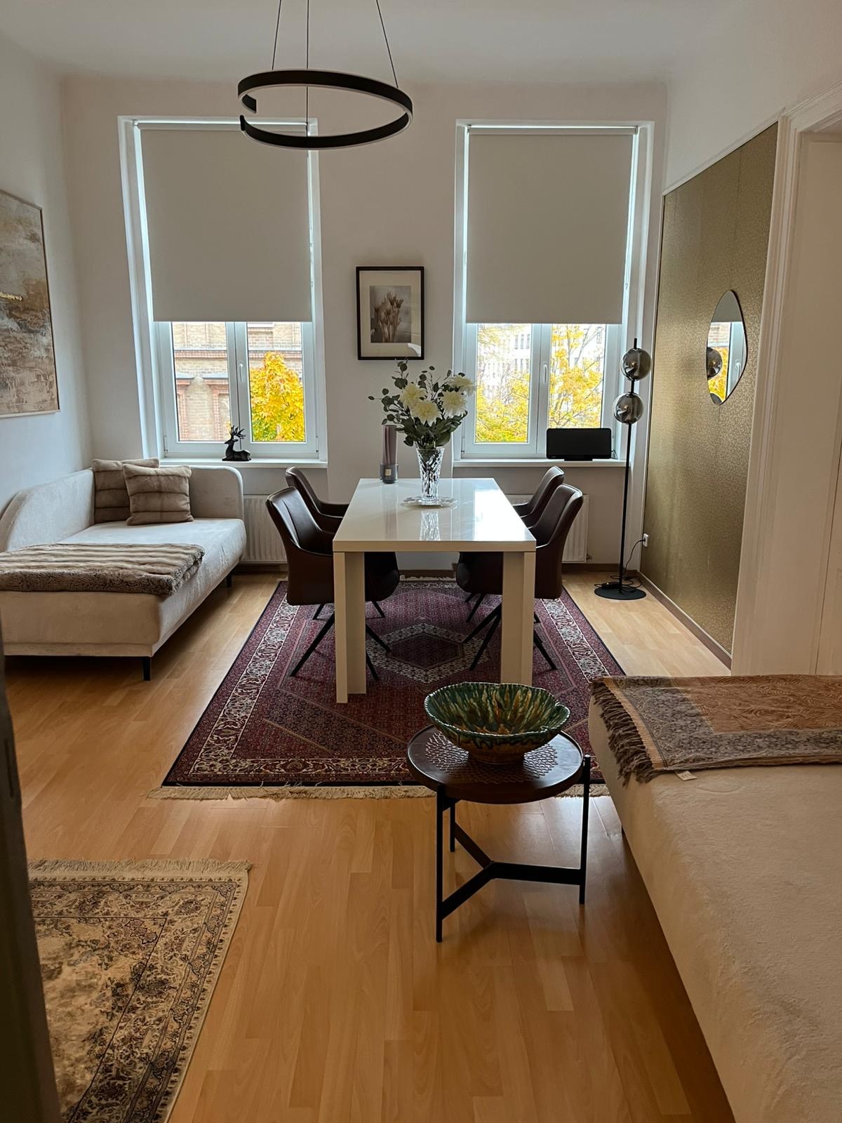 Discover city living at its finest in our newly renovated, highly central 40m² apartment. Nestled on the 2nd floor of a historic building, this exclusive space boasts a spacious living room, comfy bedroom, bathroom with toilet, and a well-equipped kitchen. Additional amenities include a sofa bed, TV, WLAN, washing machine, and a full kitchen setup. All your daily needs, shops, cafés and restaurants just around the corner. Immerse in art, culture, shopping and sights steps away.