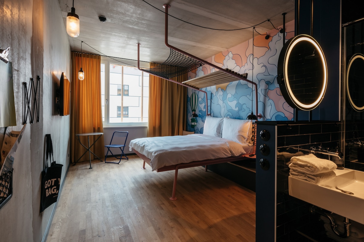 Ready for take-off? For all the pioneers and adventurers out there, we have built the explorer bed. Take off into your very own Viennese adventure. This quiet room offers everything you need: a glassed-in rain shower, fluffy towels and sheets of fair-trade quality, responsibly sourced shower gel & shampoo, mega-watt hairdryer, flat-screen TV, mobile desk & chair and separate WC.
