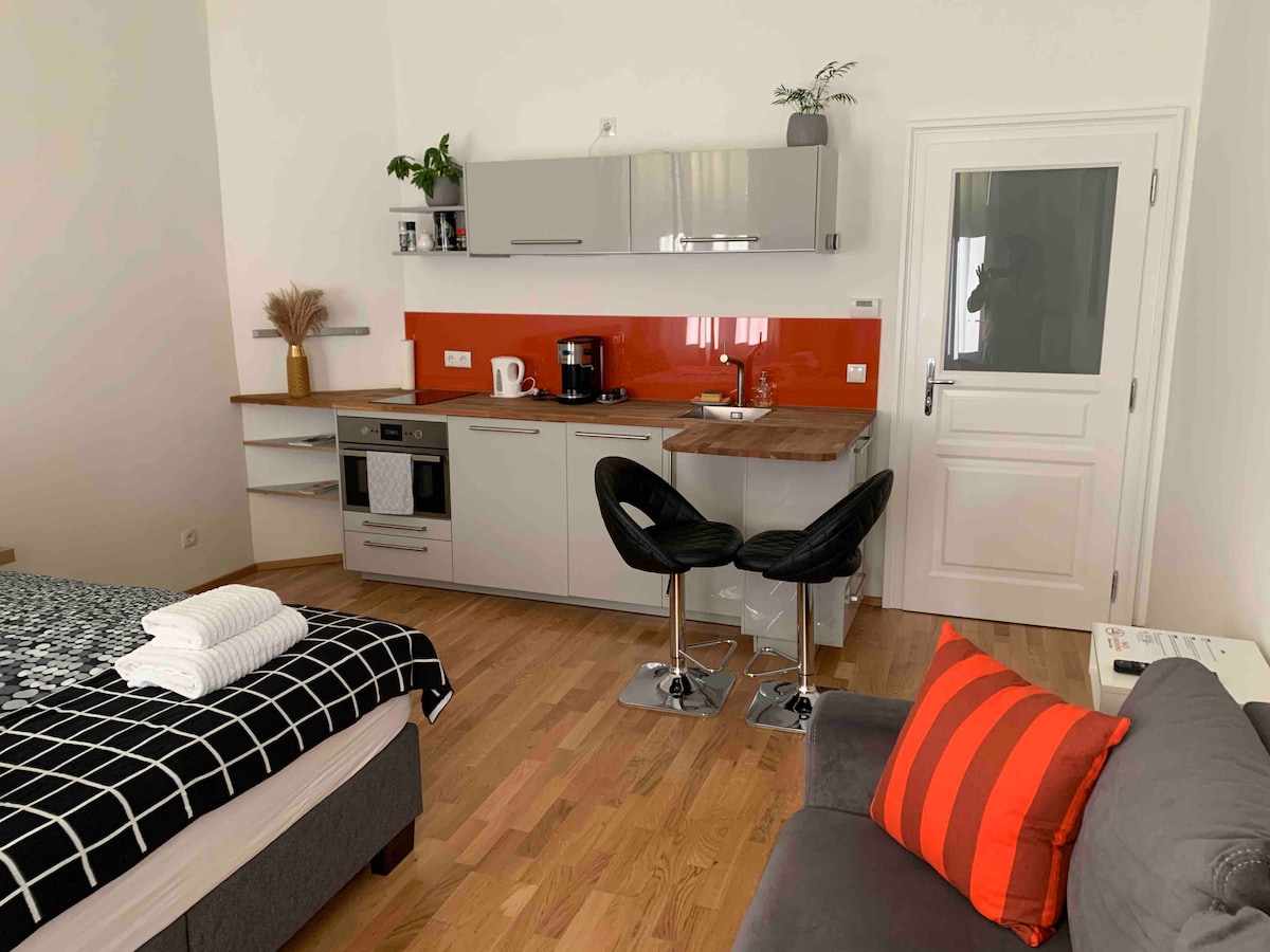 The apartment is centrally located in Vienna, 3 minutes from Westbahnhof trainstation. It is located in a beautiful typical Viennese old building, which was completely renovated a few years ago. It is modernly furnished, has room for 1-2 persons and consists of: anteroom, living/sleeping room with integrated kitchen, bathroom, toilet.