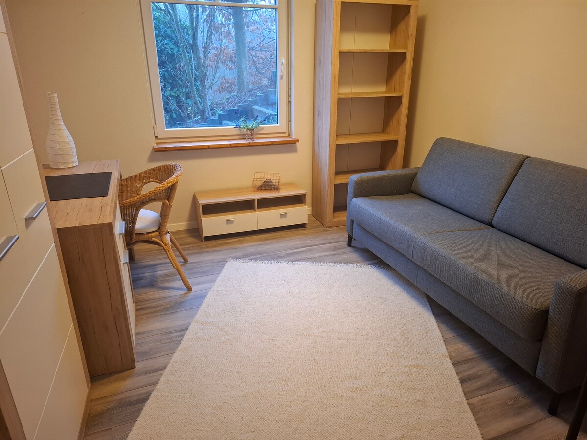 1 room with for 2 people,couch,small fully equipped kitchen,bathroom with window. The apartment has its own entrance in a green,quiet location at the gates of Koblenz, 5minutes to the university;Walks on the edge of the forest possible; Seating area outside; 10 minutes by car to the city of Koblenz,the Rhine Valley or the Moselle Valley;for nature lovers-hikers and guests who like to live quietly in the countryside and are still well connected to all the highlights in the region. (car required)