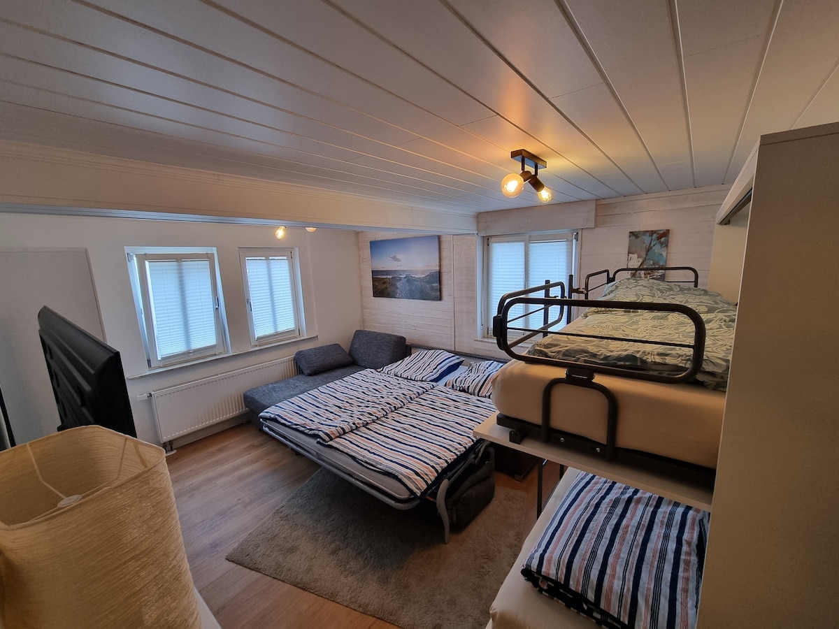 Willkommen in deinem Zuhause auf Zeit! Unsere helle Dachgeschosswohnung mit großem Balkon verbindet Komfort und modernes Design. Ob Urlaub oder Geschäftsreise, hier kannst du dich sofort wohlfühlen. Die moderne Küche lädt zum gemeinsamen Kochen ein, der Balkon zu Kaffee, Sonne und Entspannung. Am Tischkicker wartet Spaß für Groß und Klein. Offene Räume, viel Licht und eine gemütliche Atmosphäre machen die Wohnung besonders. Es ist Platz für bis zu vier Erwachsene und ein Kleinkind.