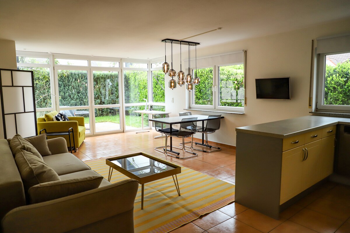 Willkommen in unserer modernen und hellen Souterrain-Wohnung mit eigenem Außenbereich. Die vielen Fenster und die offene Gestaltung der Wohnung liefern ein angenehm helles und einladendes Wohngefühl. Ob für Geschäftsreisende, Familien oder Wochenendbesucher:innen - die Wohnung bietet den idealen Rückzusort mit guter Anbindung an die Stadt! Die Wohnung befindet sich in einem ruhigen, familienfreundlichen Viertel mit Parkplätzen und ist die perfekte Mischung aus Erholung, Natur und Stadtnähe.