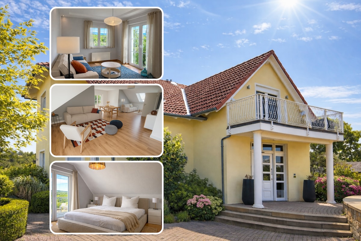 Architektenhaus mit Landschaftsblick, liegt mitten in den Weinbergen Rheinhessens inkl. eigenem Privat-SPA (gegen Gebühr), Großer Garten mit Teich, Sonnenterrasse mit Loungemöbel, Balkone, 3 Schlafzimmer, offener Küche, Musikzimmer mit Kaminofen, offener Wohn-Essbereich. Naturmaterialien wie Holz/Kautschuk/Kork Nahe Mainz/Wiesbaden/Frankfurt. Beste Weingüter mit Weinverkauf. Gastronomie fußläufig mit herrlichem Innenhof oder Aussichtsterrasse, auch vegan. Ideal für Wanderungen und Radfahren.
